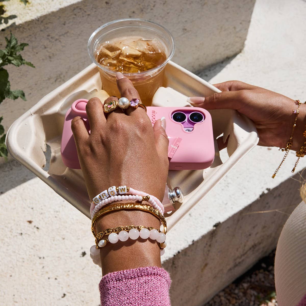 A polished essential, the 18K Gold Pink Quartz Pearl Steel Bead Bracelet transitions seamlessly from casual to elevated looks.
