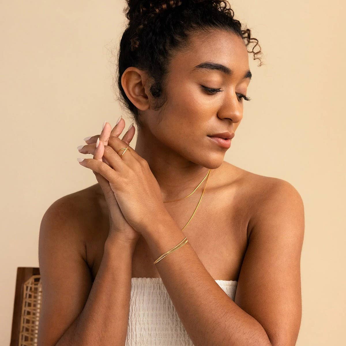 The 18K Gold Triple Layer Square Snake Chain Bracelet adds a refined touch with its clean and modern silhouette.