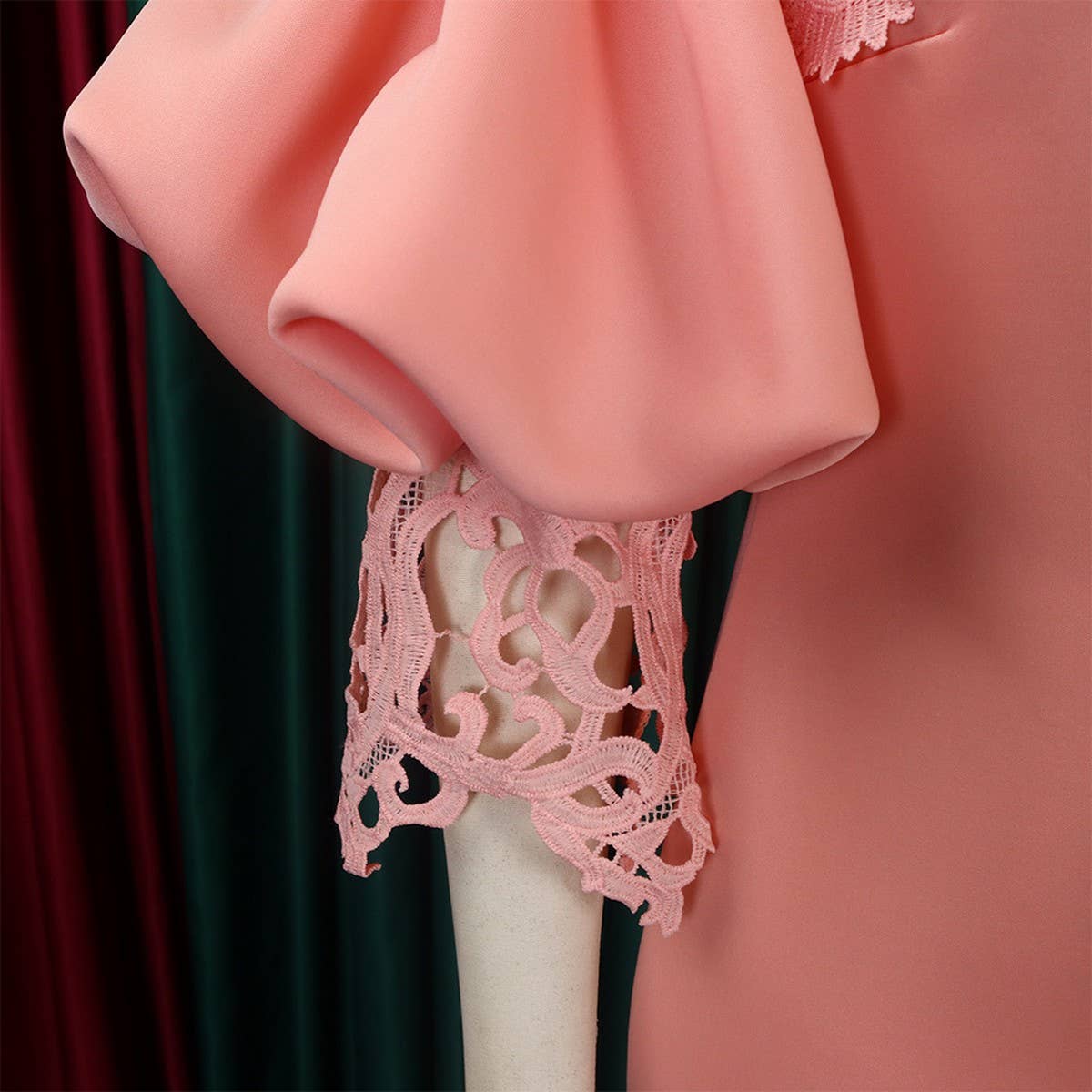 BOAT NECK LACE PATCHWORK LANTERN SLEEVE DRESS_CWDMD3683
