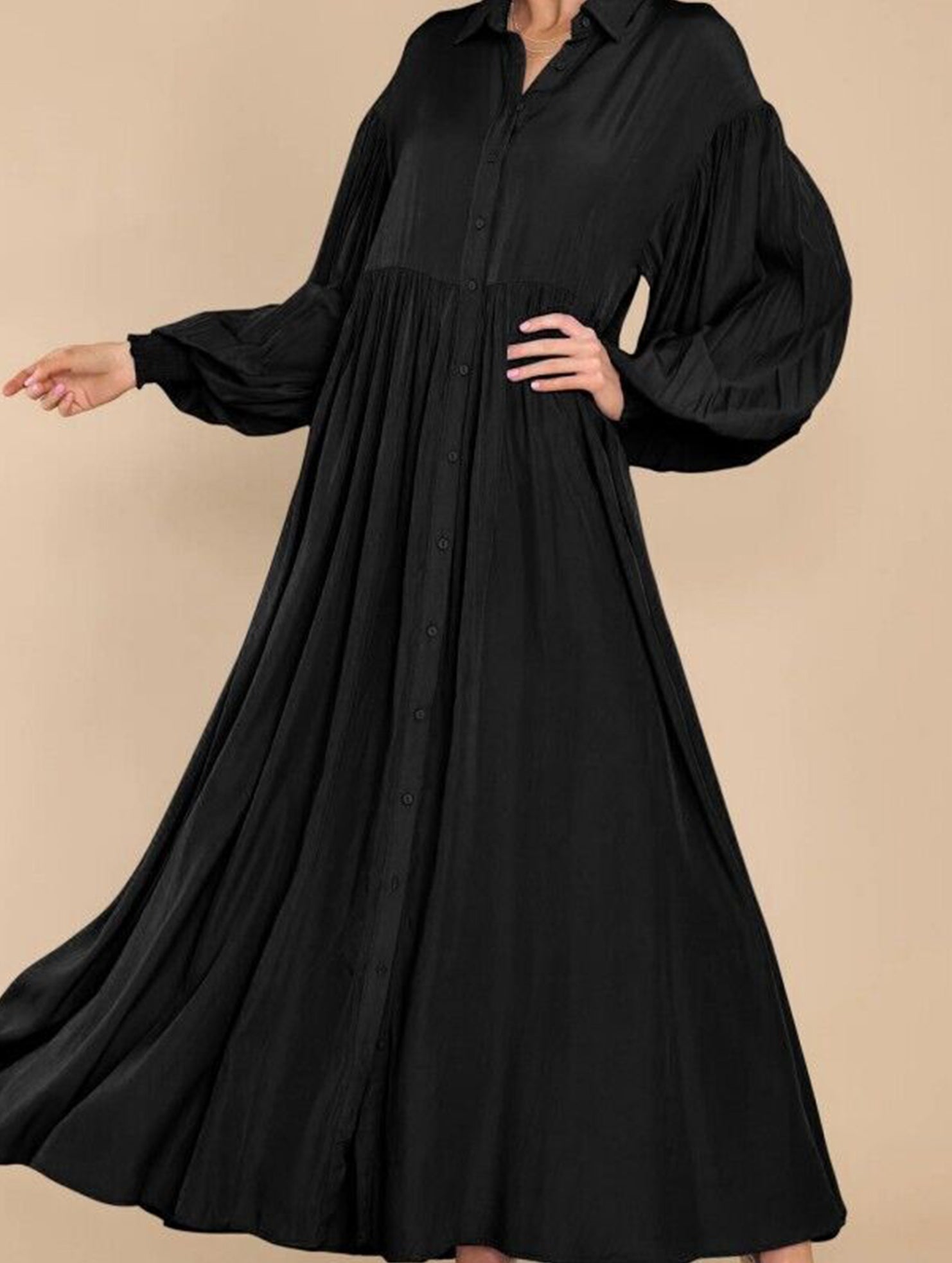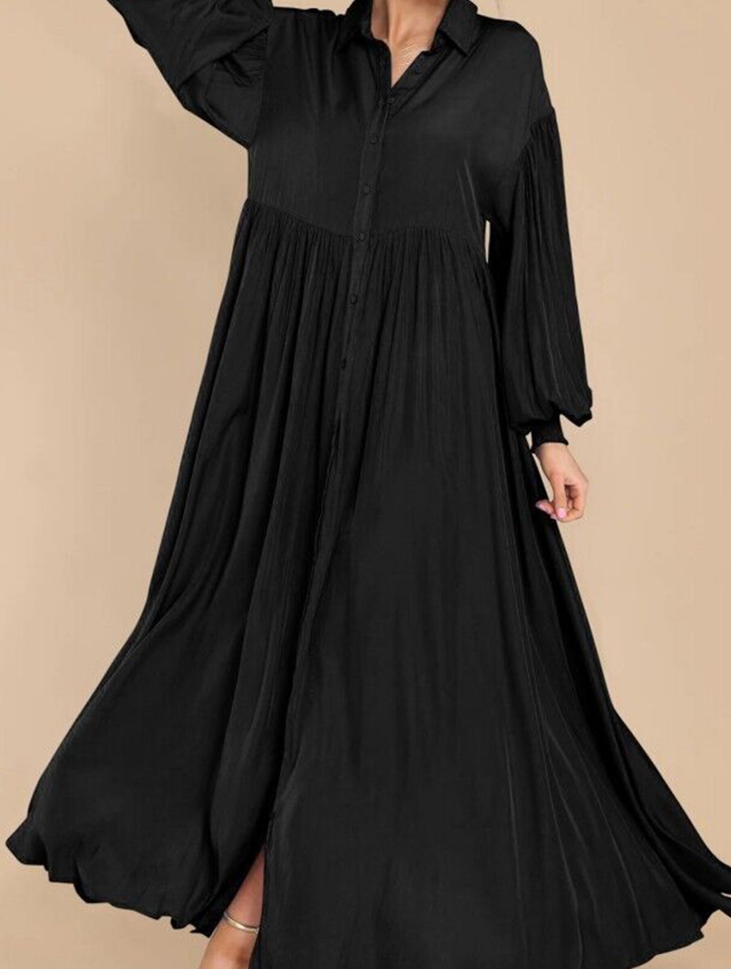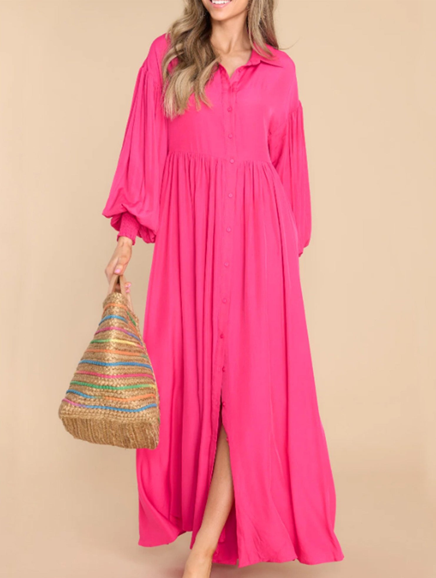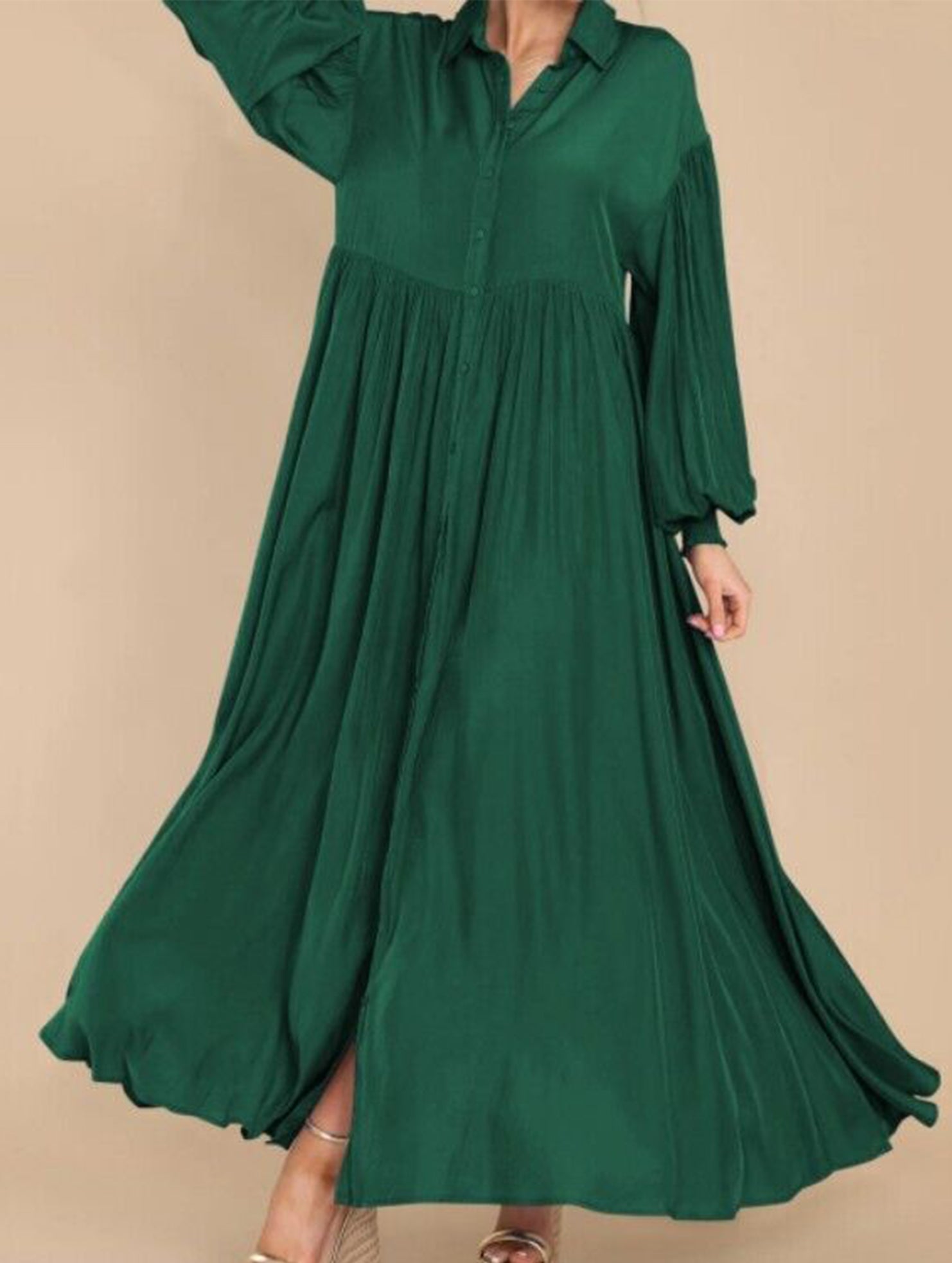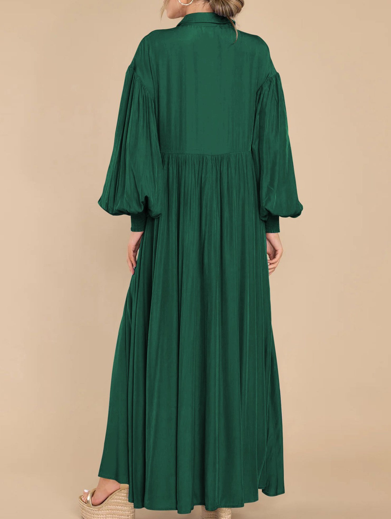 Button-Down Lapel Pleated Long-Sleeve Maxi Dress