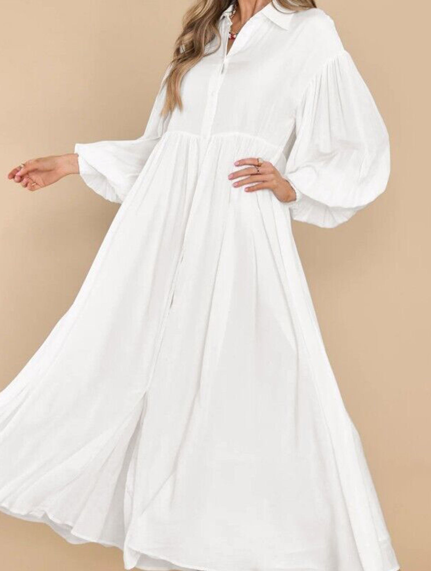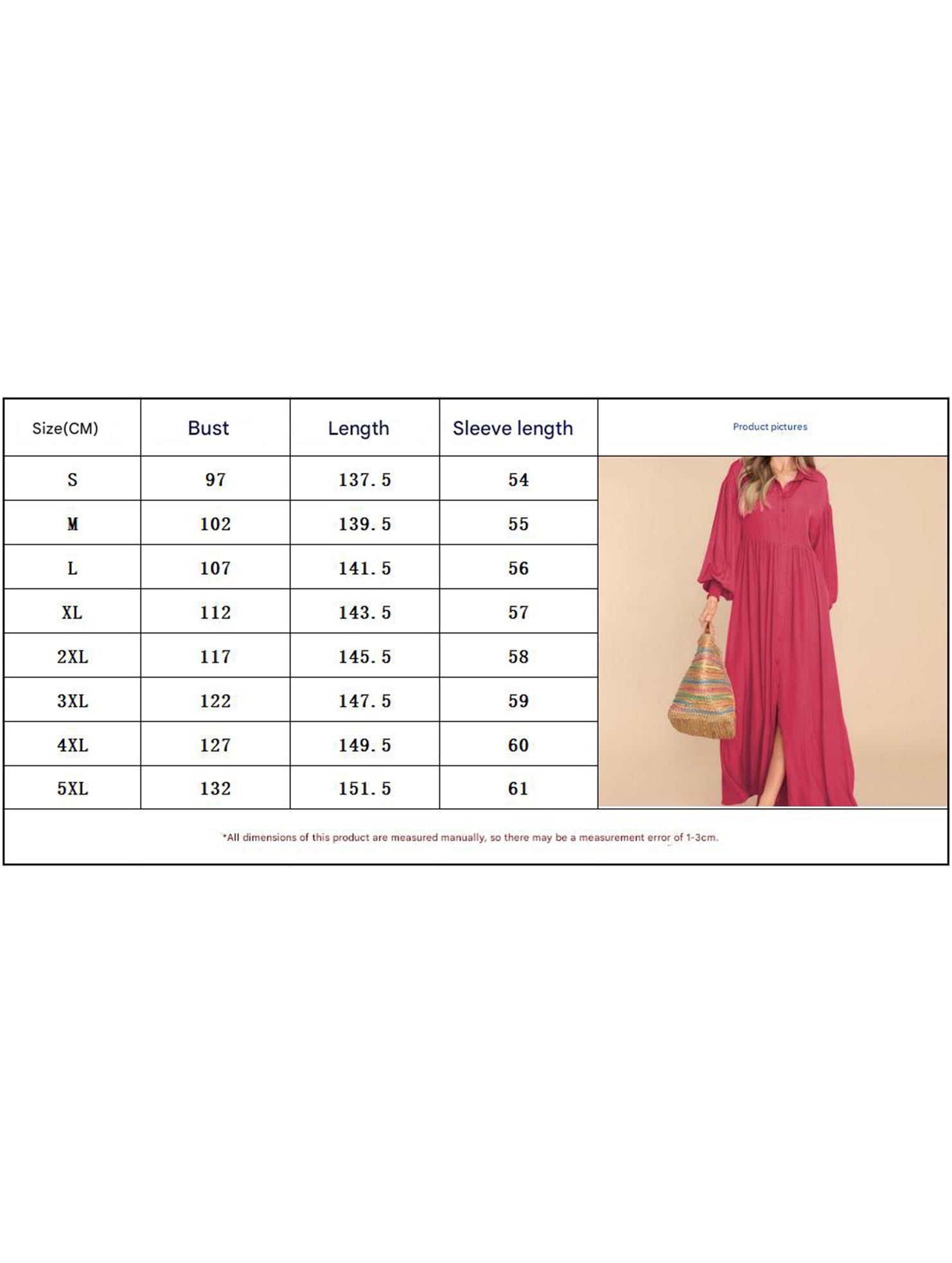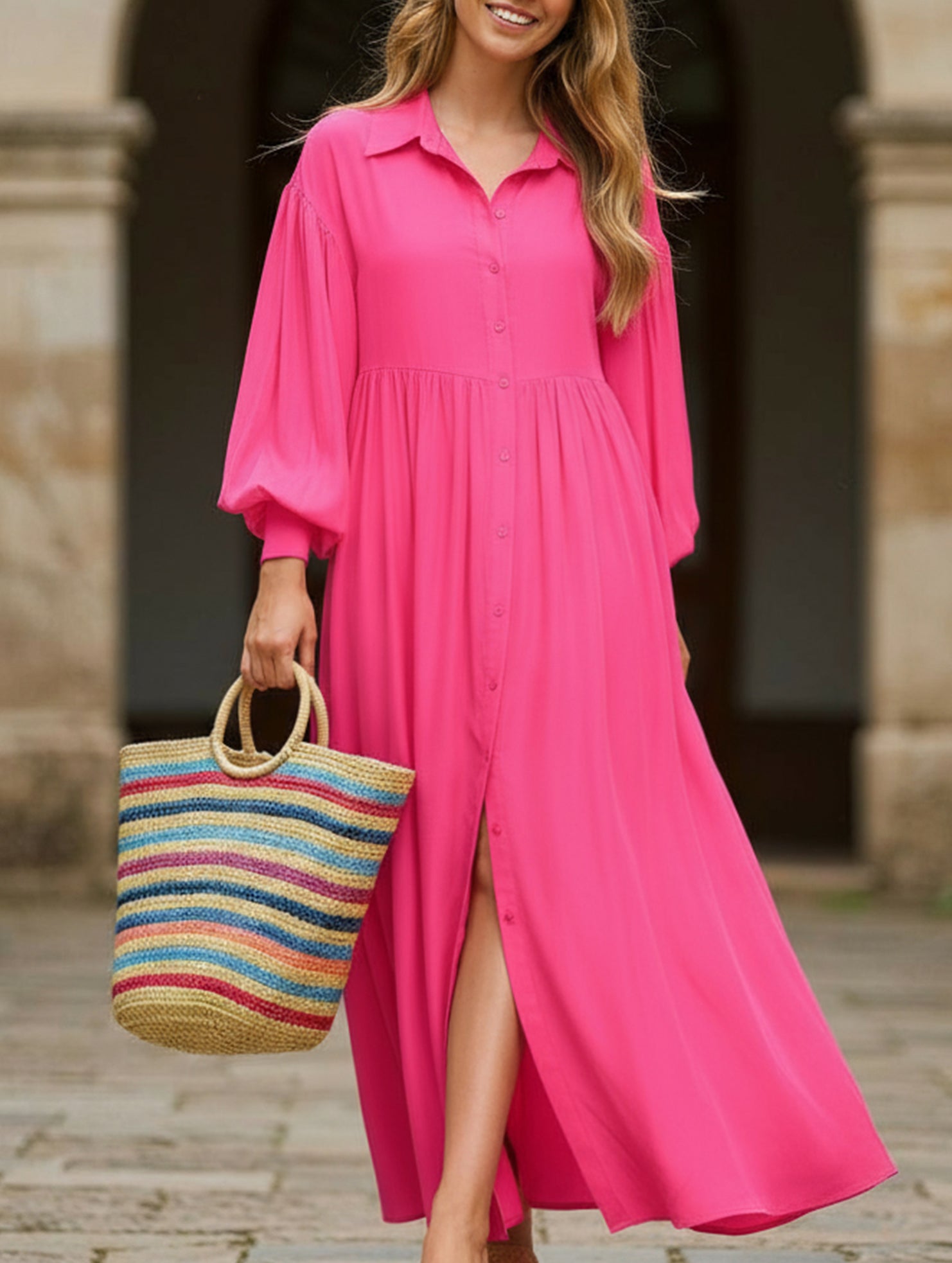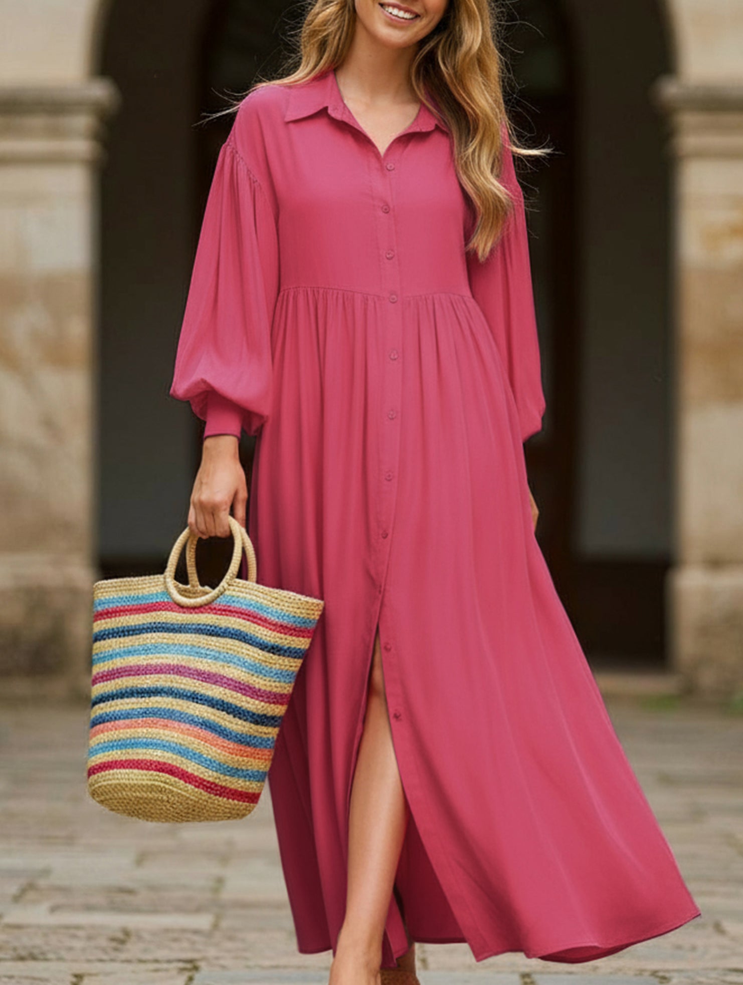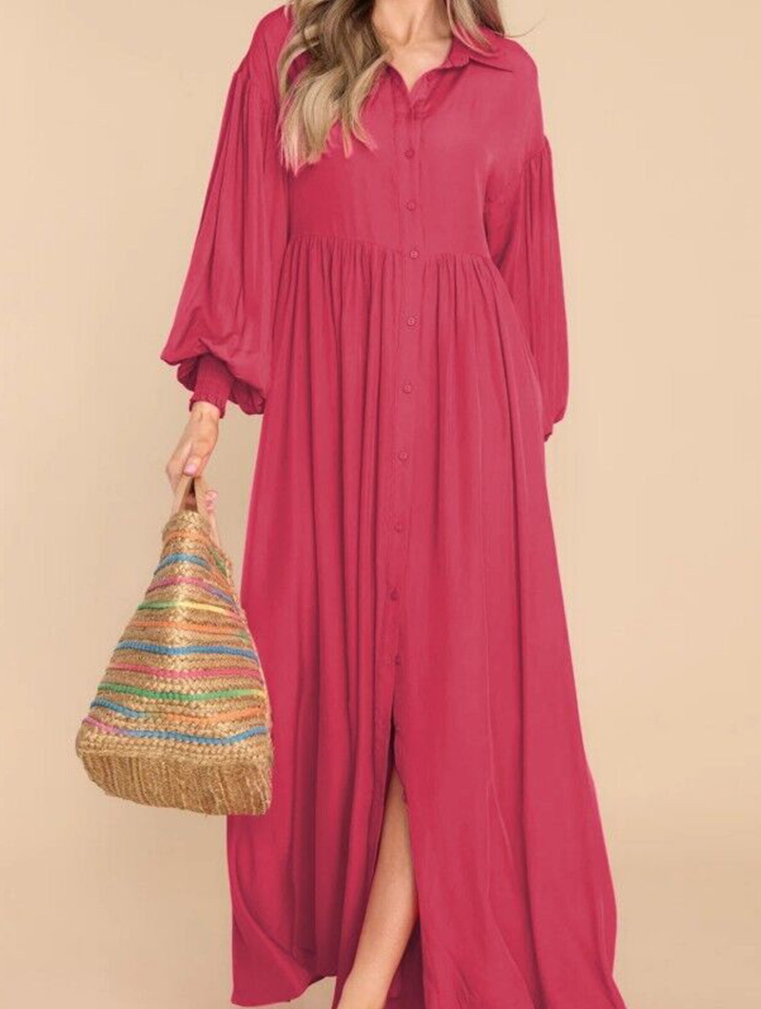 Button-Down Lapel Pleated Long-Sleeve Maxi Dress
