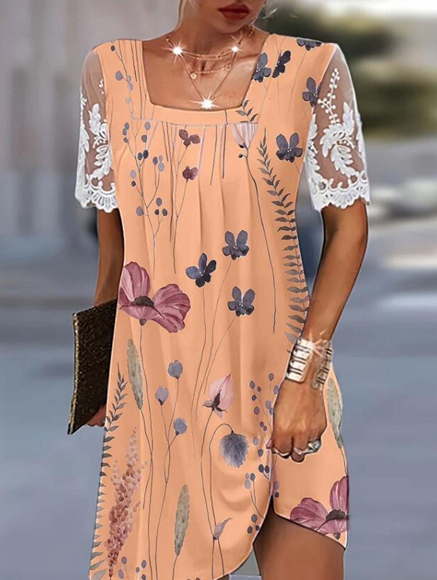 Square Neck Floral Lace Patchwork Dress ??Loose Fit Midi Sundress for Women