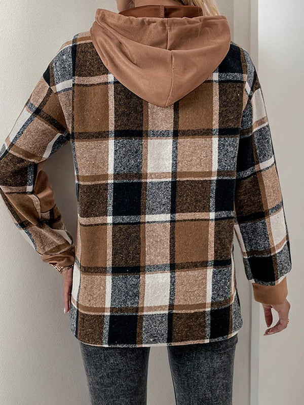 Cwohol0906_Long-Sleeved Plaid Colorblock Hooded Sweatshirt