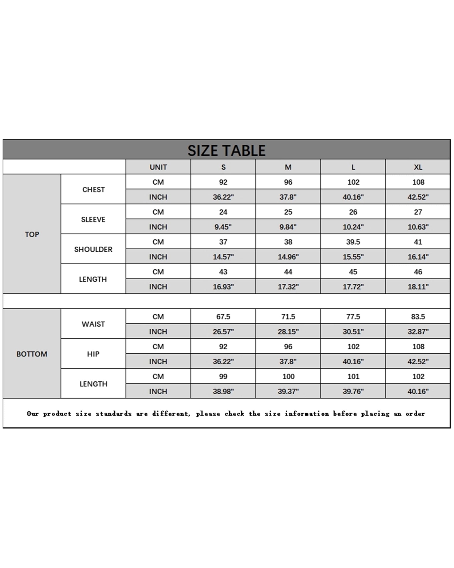 | Size | Bust (Top) | Waist (Pants) | Hip (Pants) | Length (Top) | Inseam (Pants) |