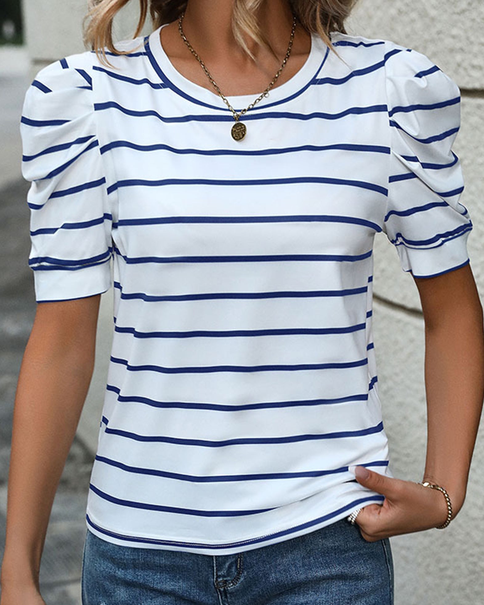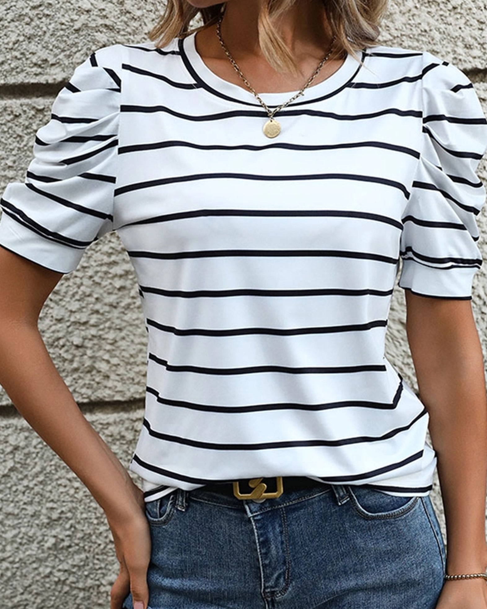 CASUAL LAMB LEG SLEEVE STRIPED CREWNECK T-SHIRT