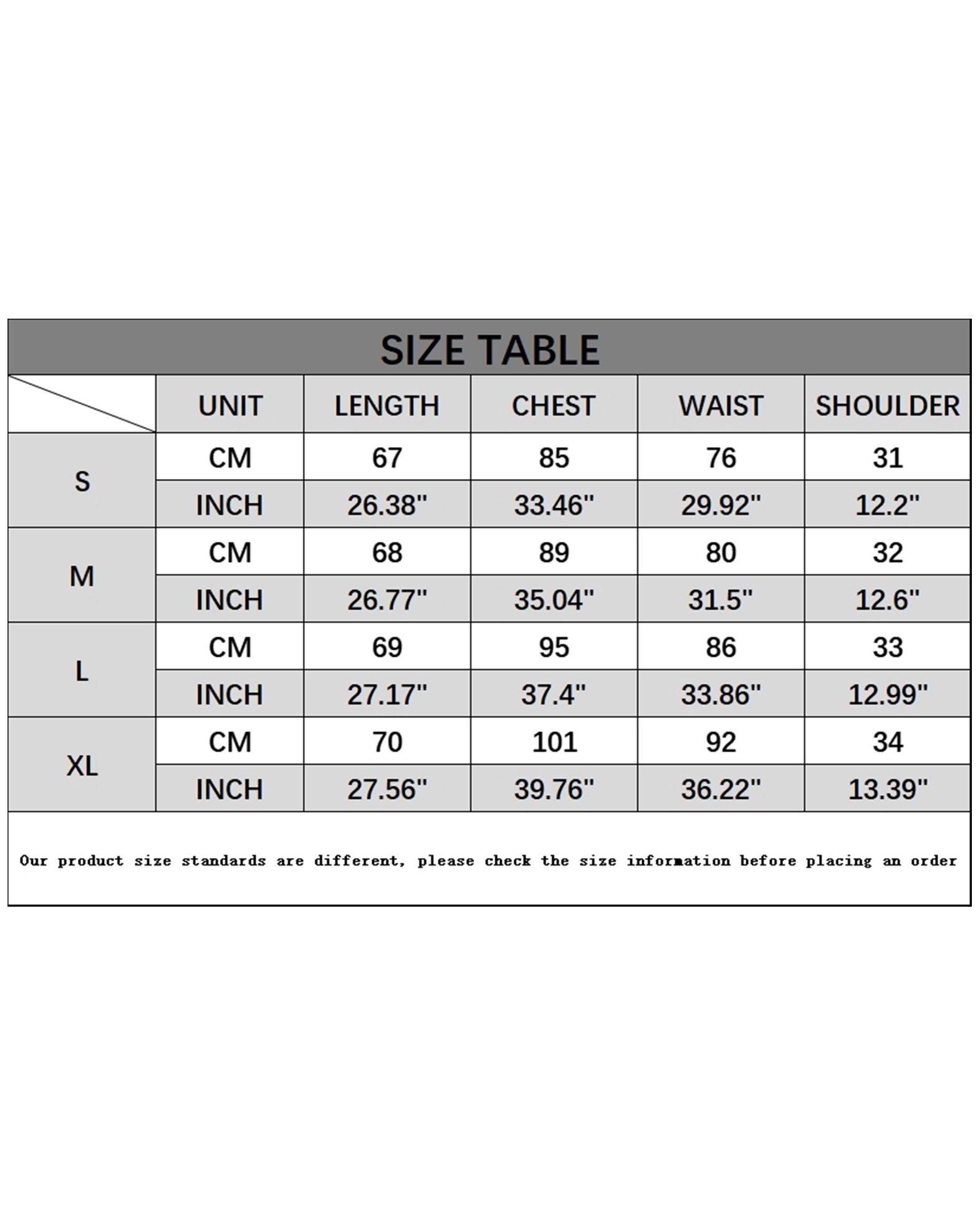 | Size | Bust | Length | Waist |