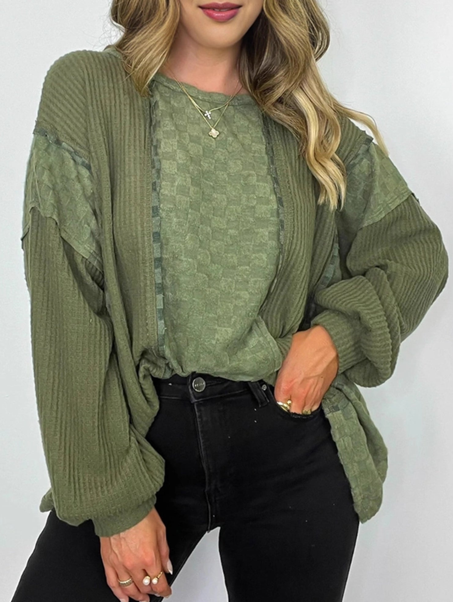 Drop Shoulder Checkered Waffle Pullover