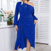 Experience versatile styling with the Elegant Asymmetrical Neck Long Sleeve Midi Dress, crafted to adapt effortlessly.