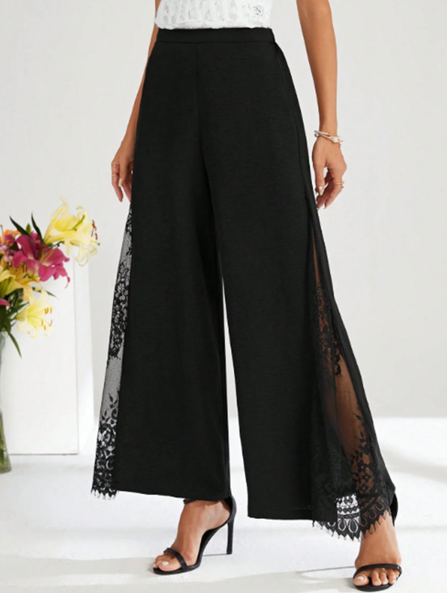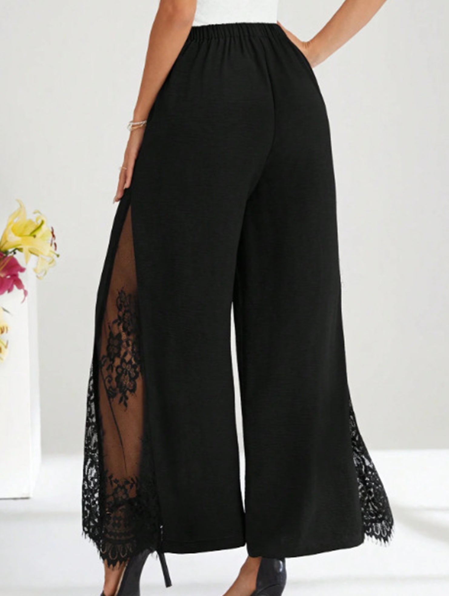 Elegant lace-trimmed high-waisted casual wide-leg pants