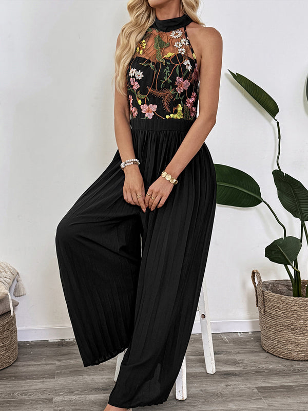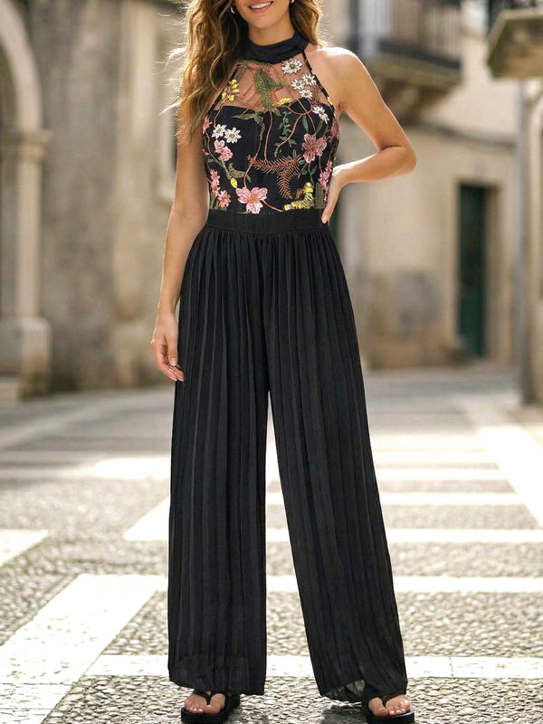 Halter-neck sleeveless lace embroidered jumpsuit