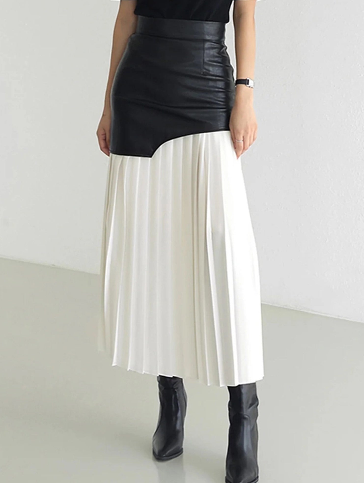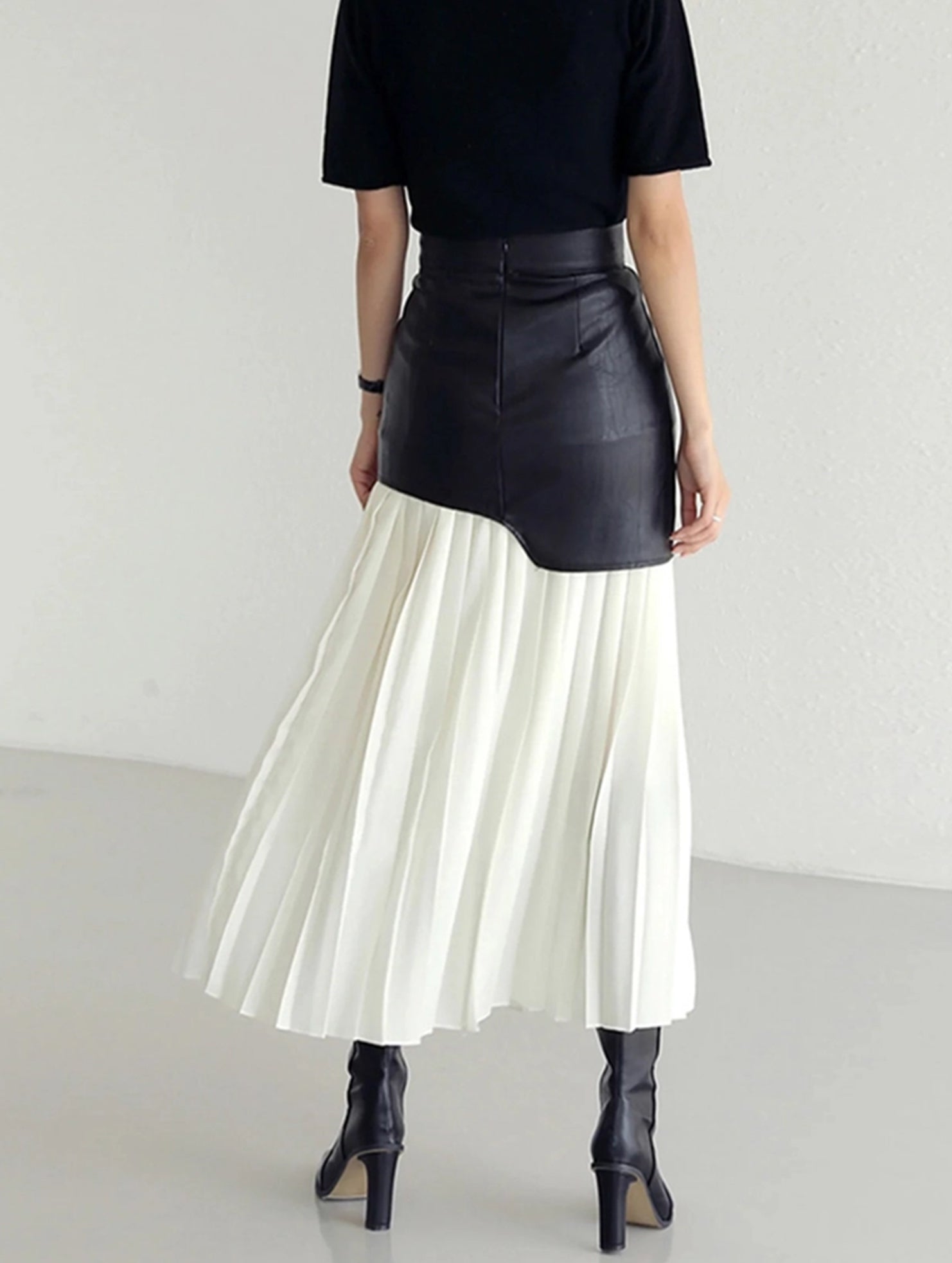 xThis patchwork leather skirt has a flattering high-waist fit and soft stretch fabric. It has a shiny black leather look at the top and a soft white pleated fabric at the bottom. The waistband sits high on your waist to give you a nice shape.