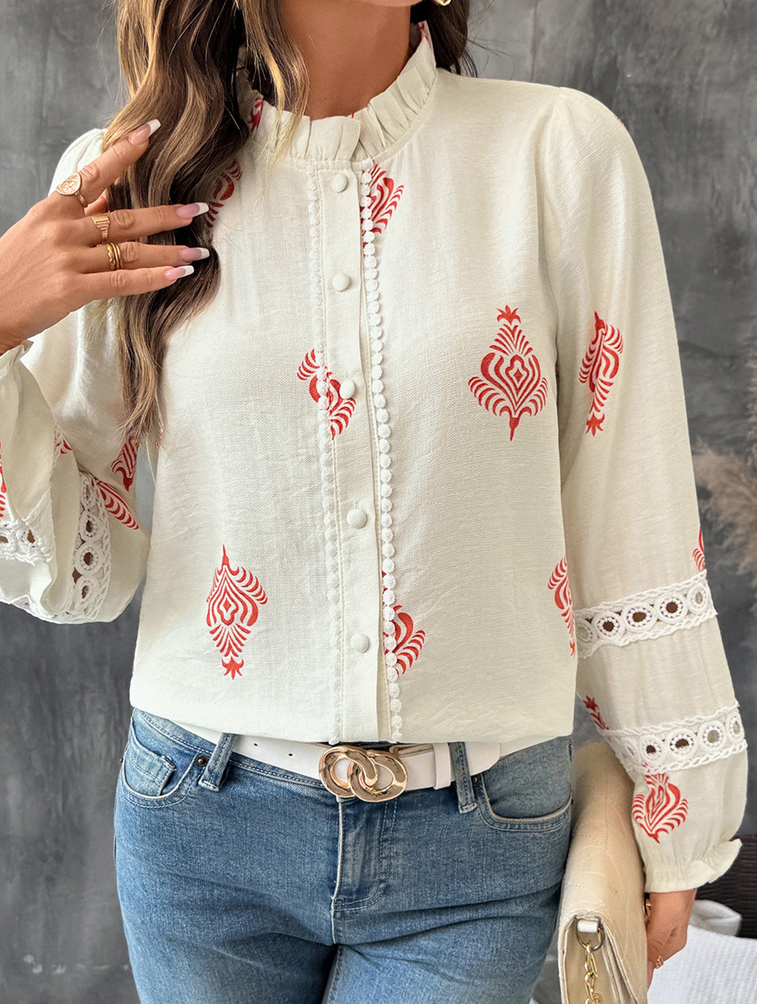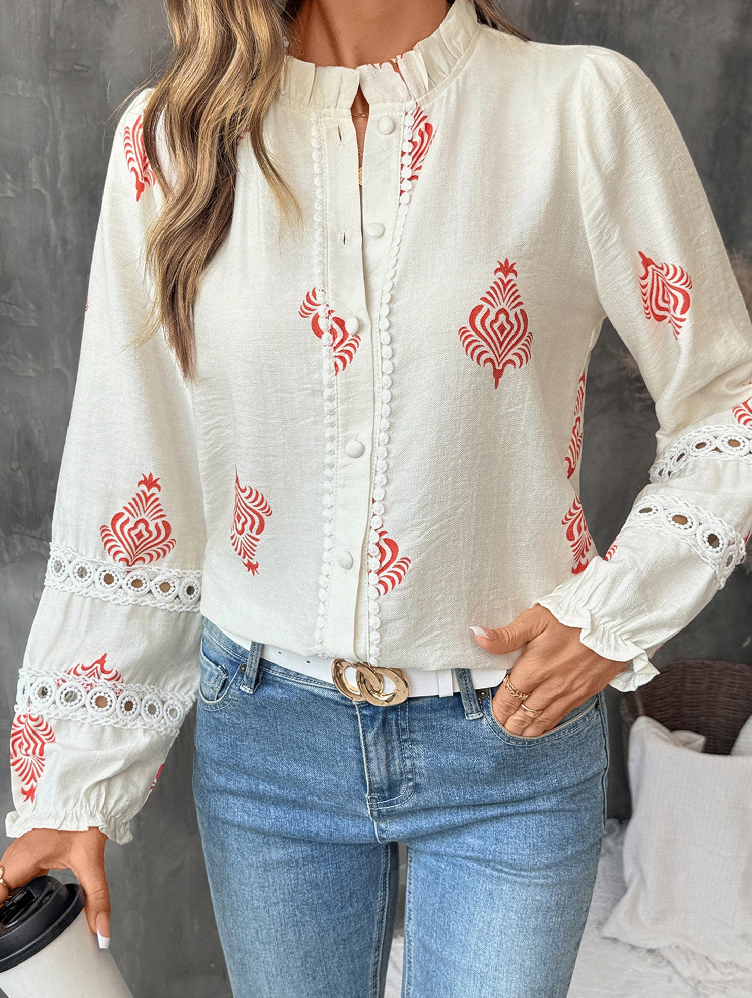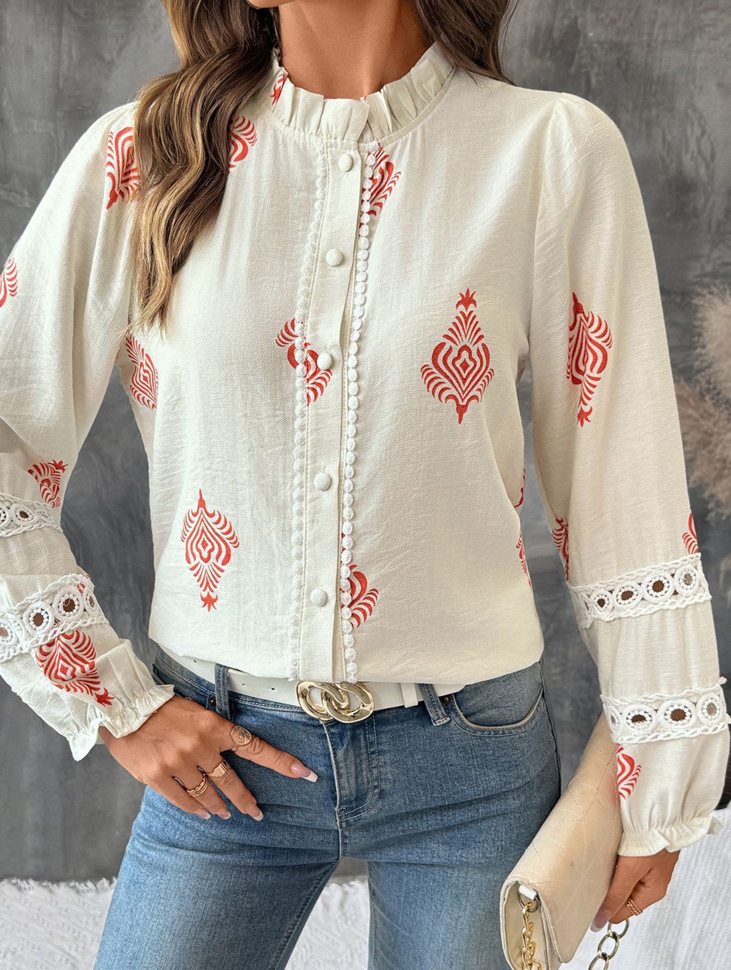 Lace Panel Round Neck Cardigan Shirt
