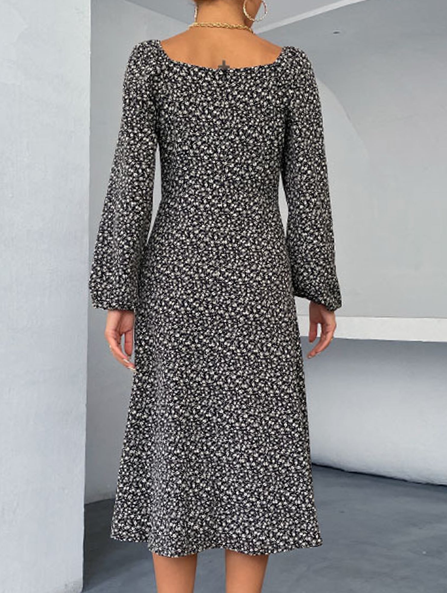 LONG-SLEEVED FLORAL SQUARE COLLAR FRENCH DRESS