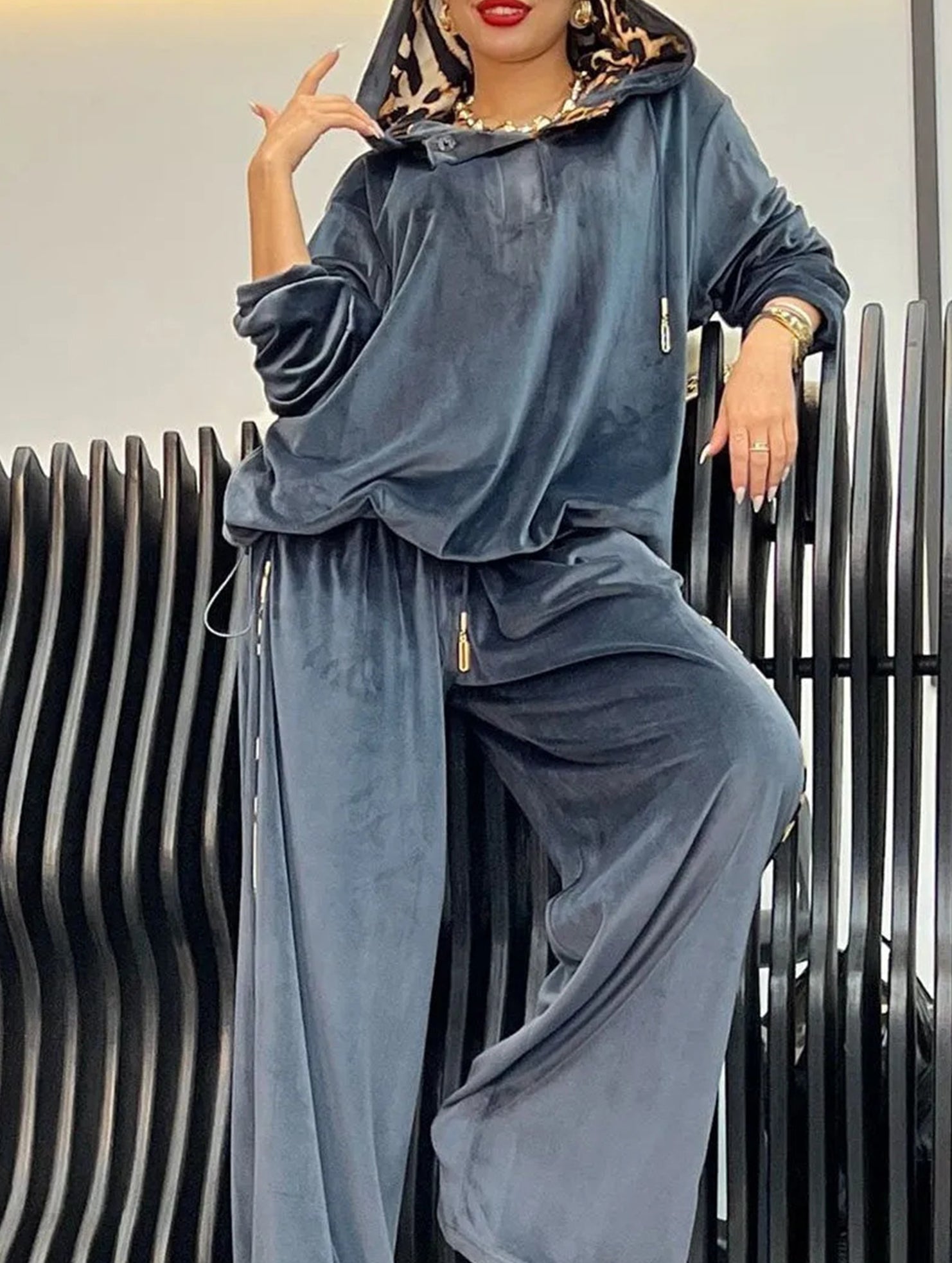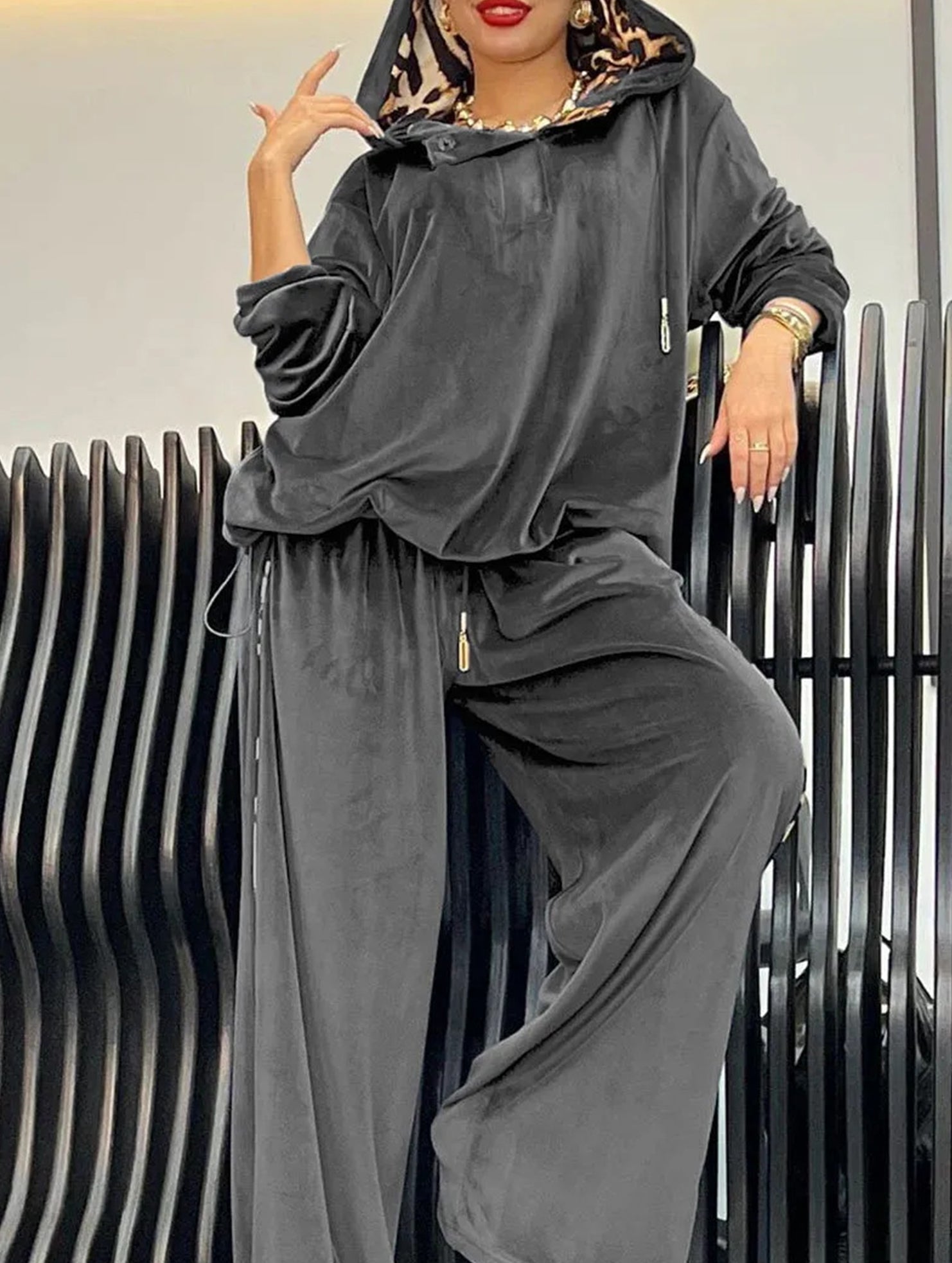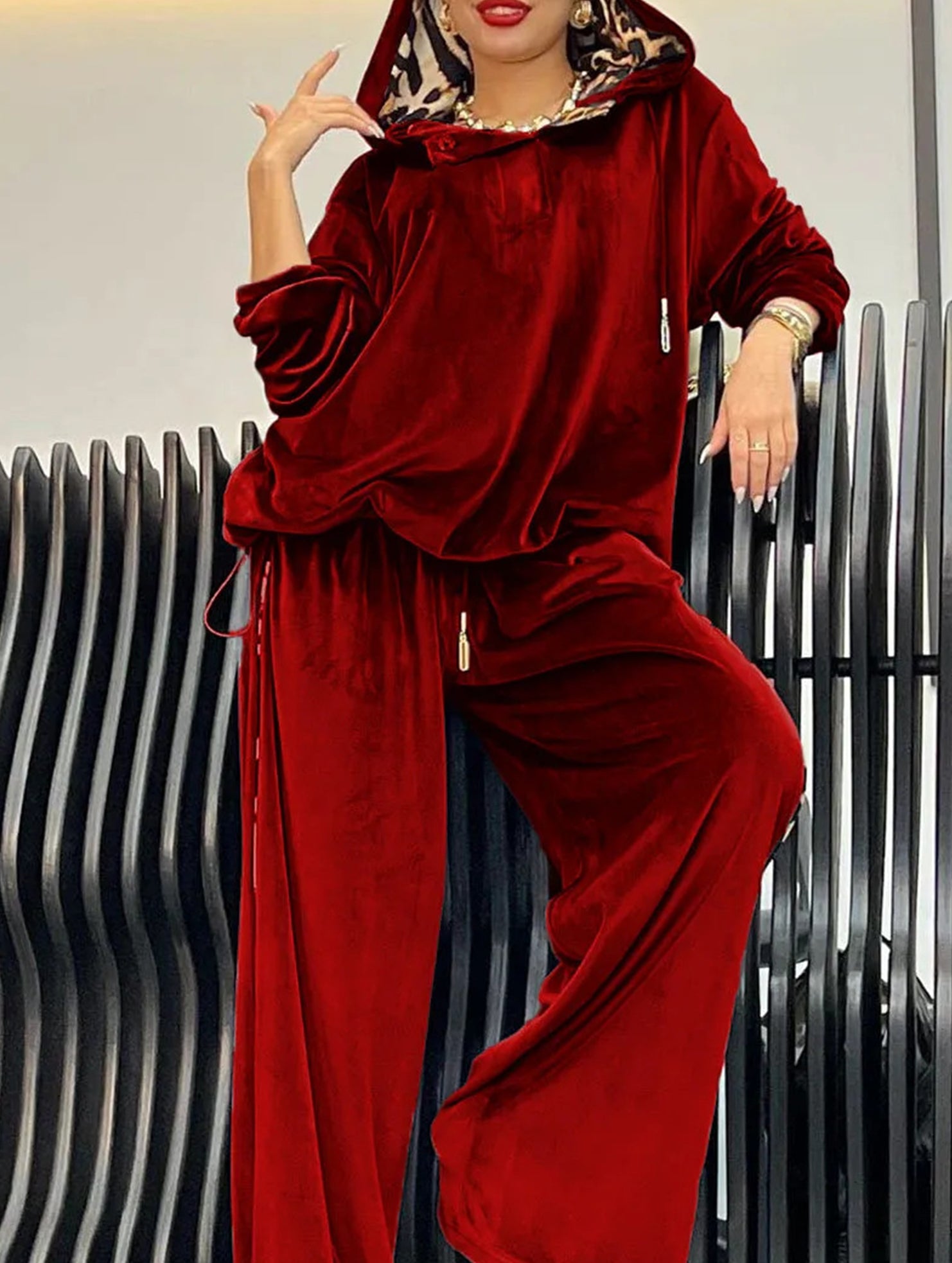 Loose-fitting two-piece leopard print hoodie set