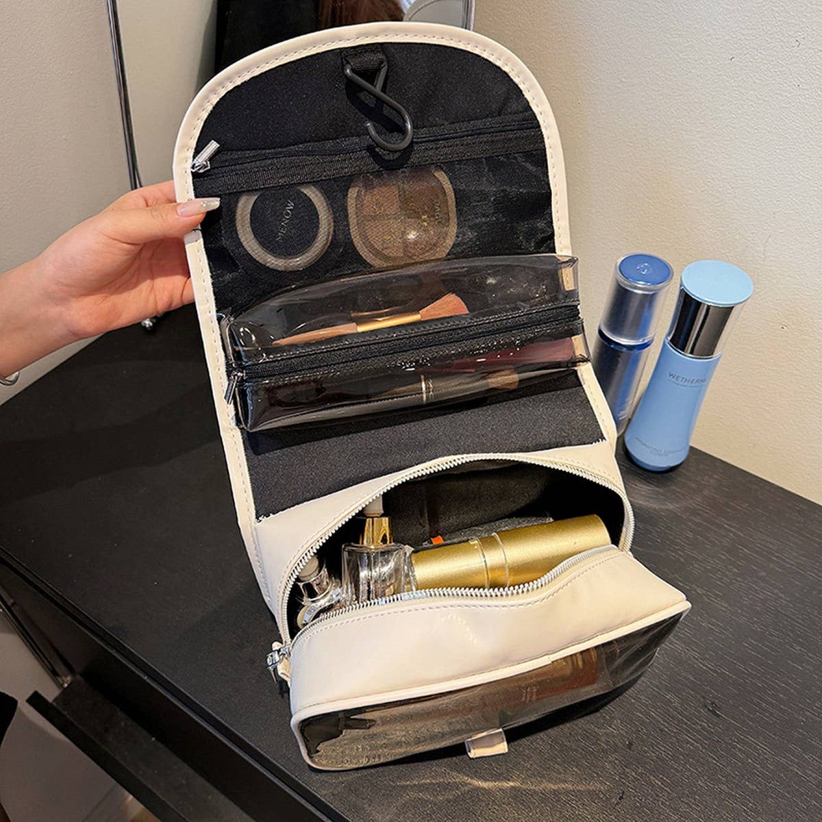The New Simple Portable Large Capacity Cosmetic Bag adds a refined touch with its clean and modern silhouette.