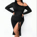 A polished essential, the Off Shoulder Asymmetrical Cinched Bodycon Dress transitions seamlessly from casual to elevated looks.
