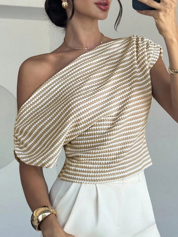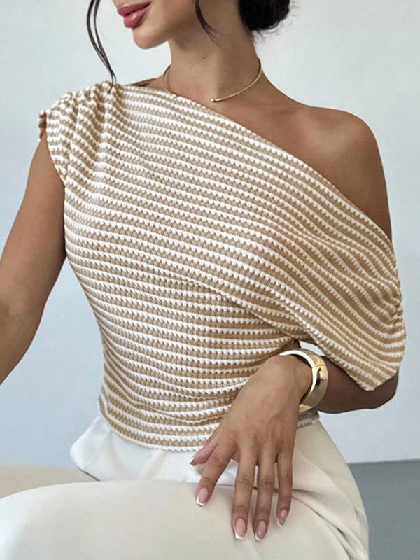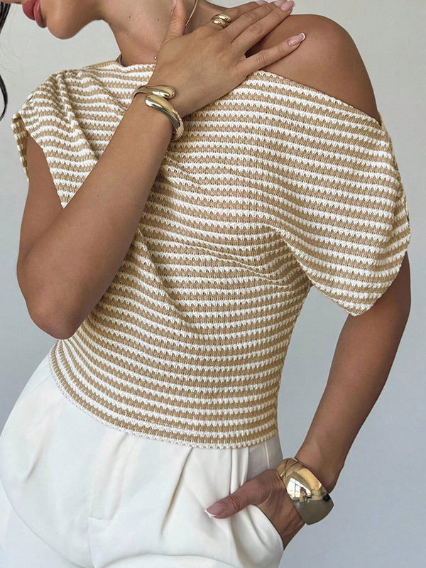 The One Shoulder Stripe Knit Tee delivers a polished look while remaining comfortable and functional.