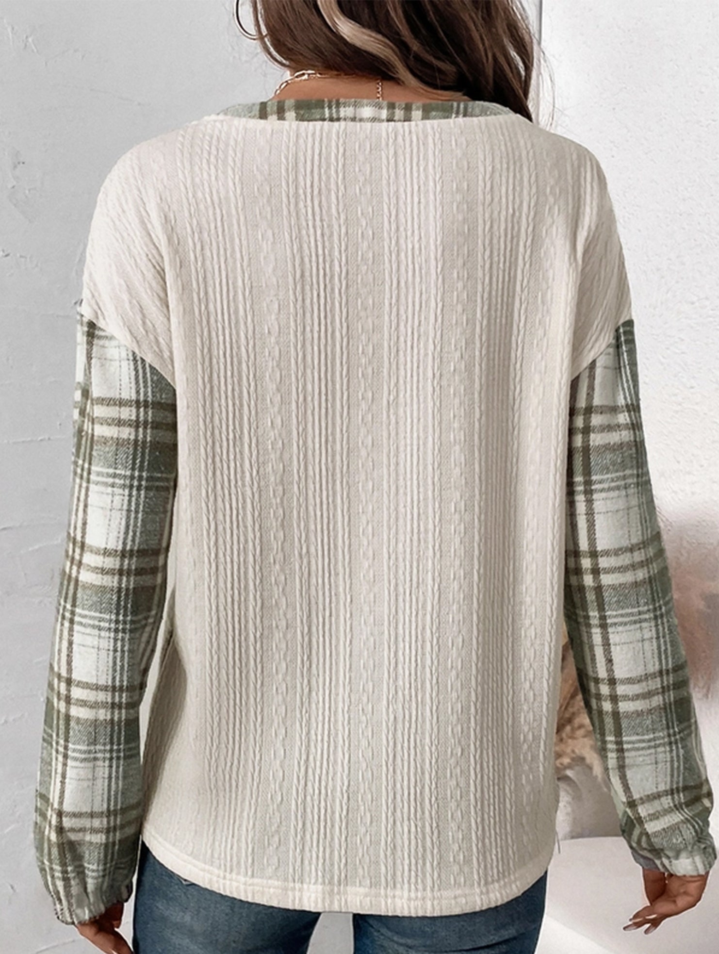 PLAID PATCHWORK LONG-SLEEVED CREW NECK T-SHIRT