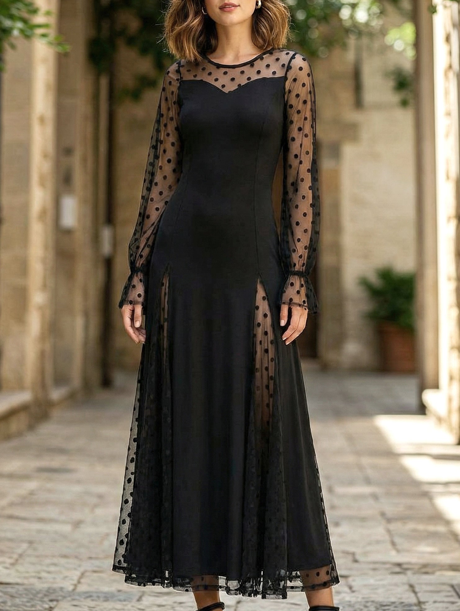 Whimsical prints meet romantic detailing. This maxi dress blends playful polka dots with delicate lace patchwork, creating a dreamy, textured look from bodice to flowing hem. A graceful side slit adds movement and a hint of allure, while the lightweight fabric ensures effortless draping. Perfect for garden parties, summer weddings, or any occasion calling for feminine charm with an artful, free-spirited edge.