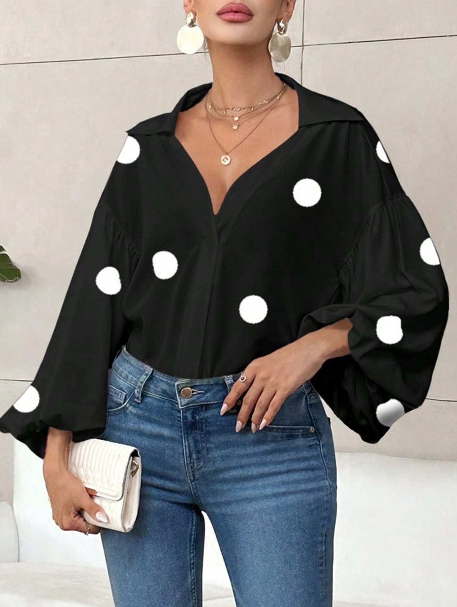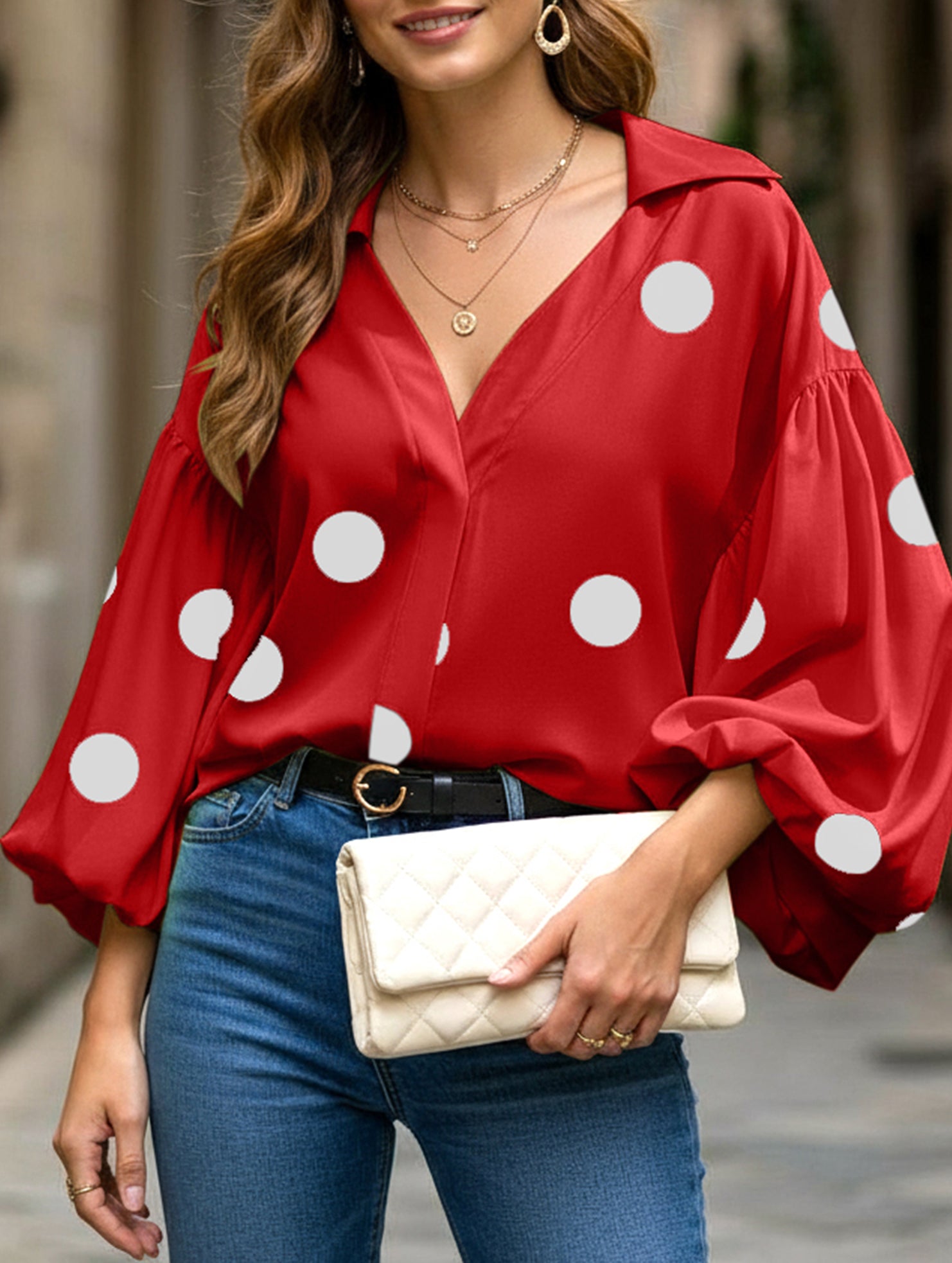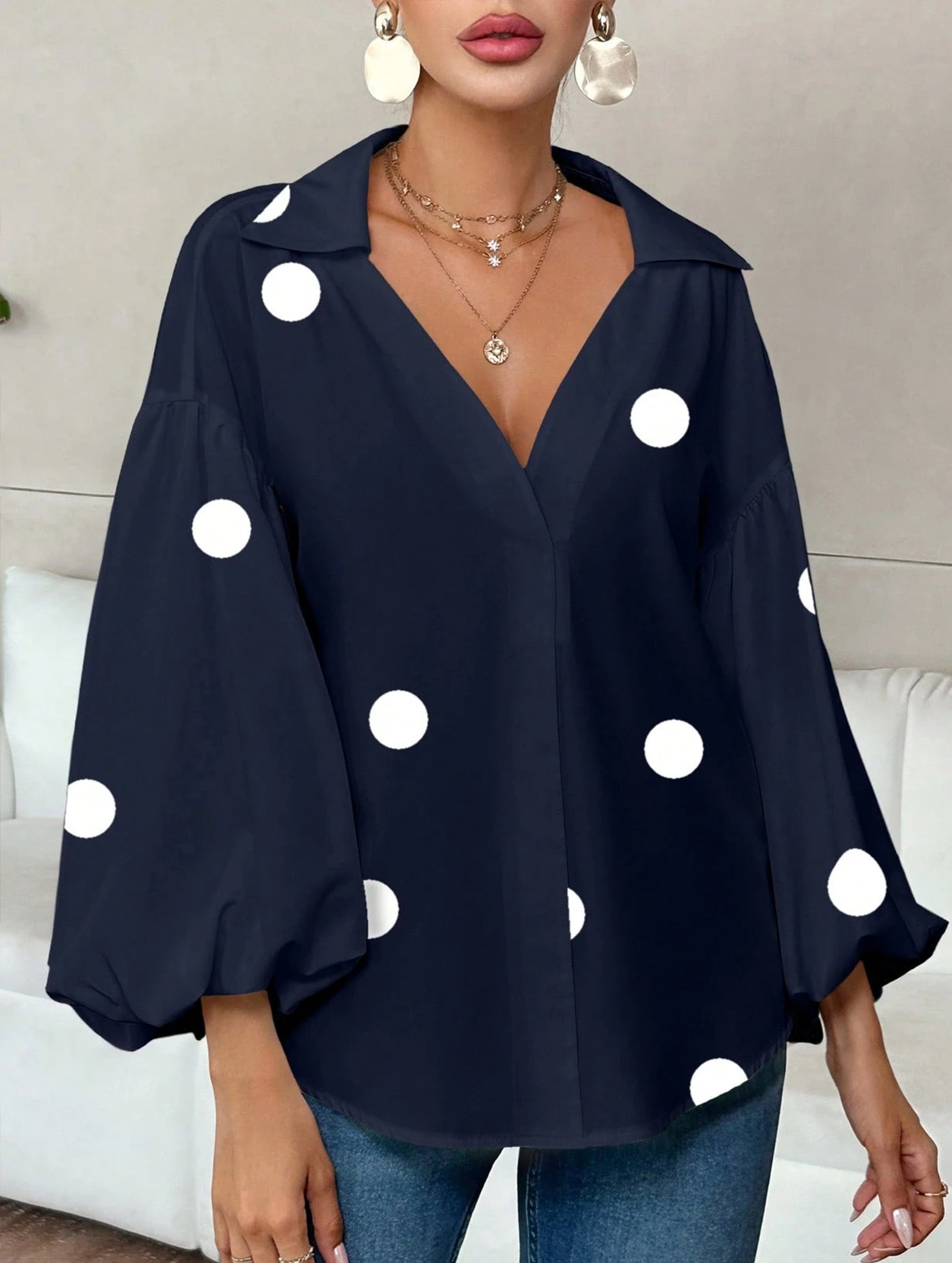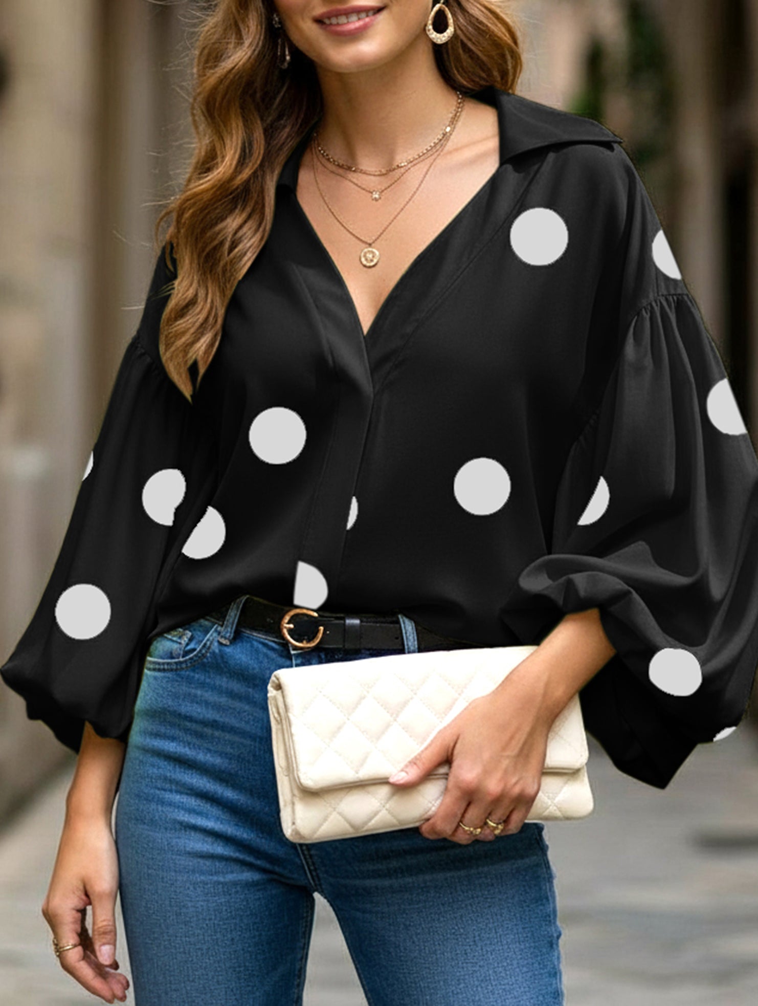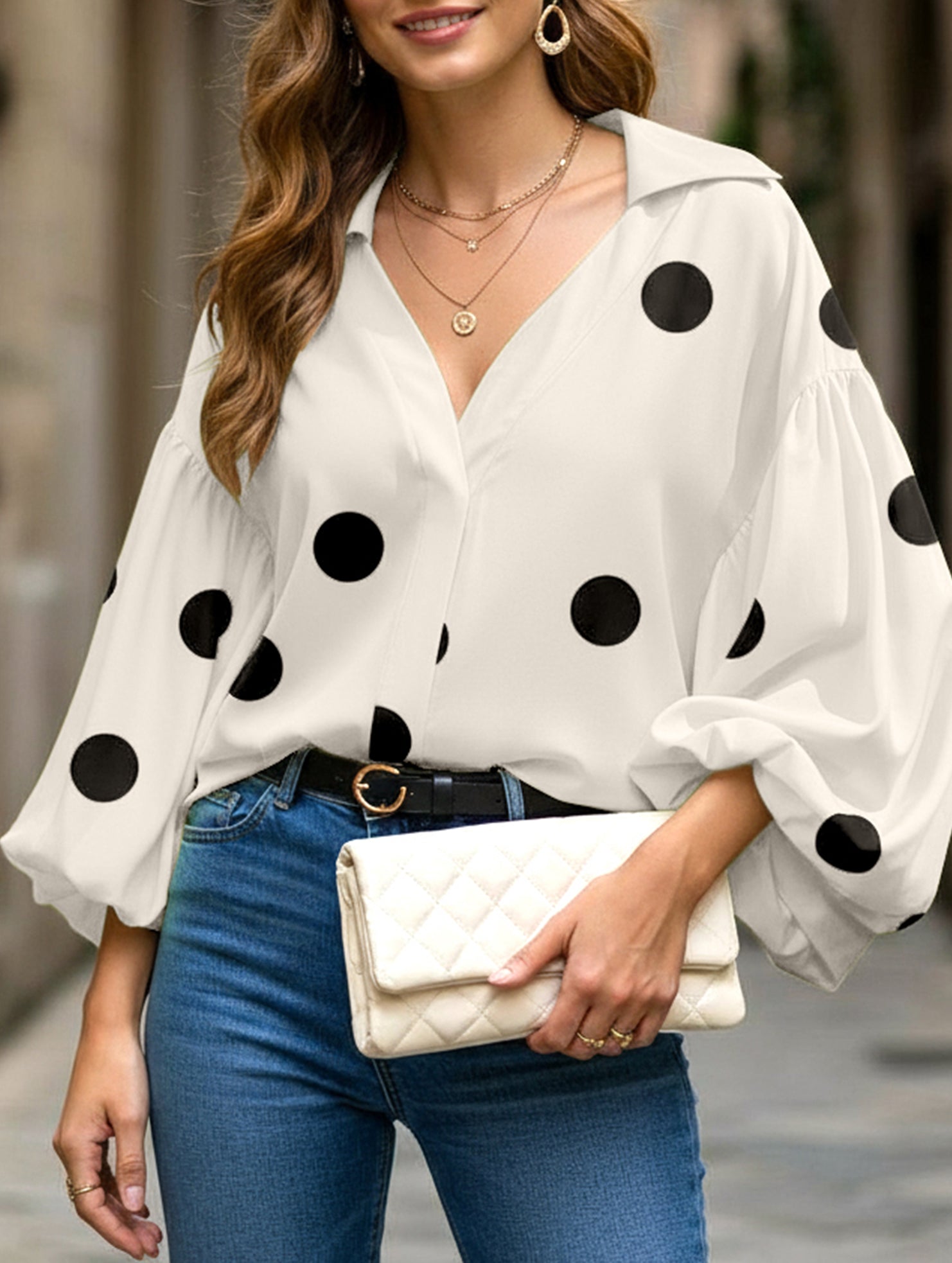 xPolka dot V-neck loose bubble long-sleeved shirt