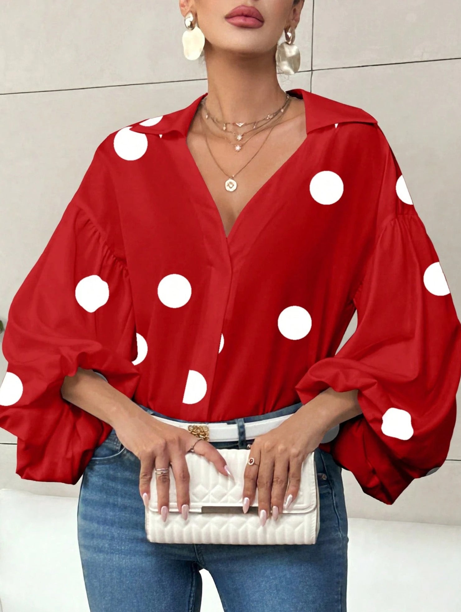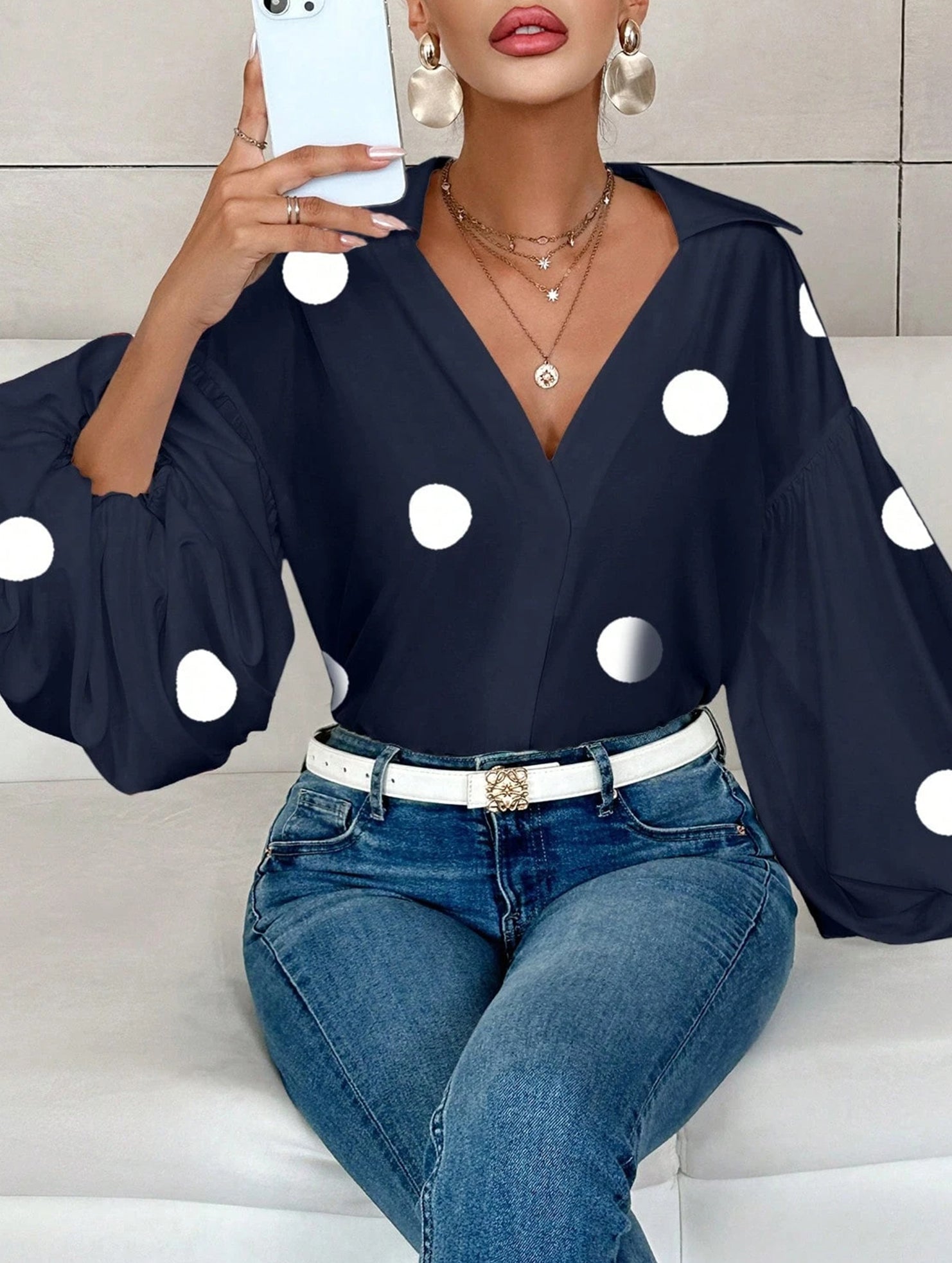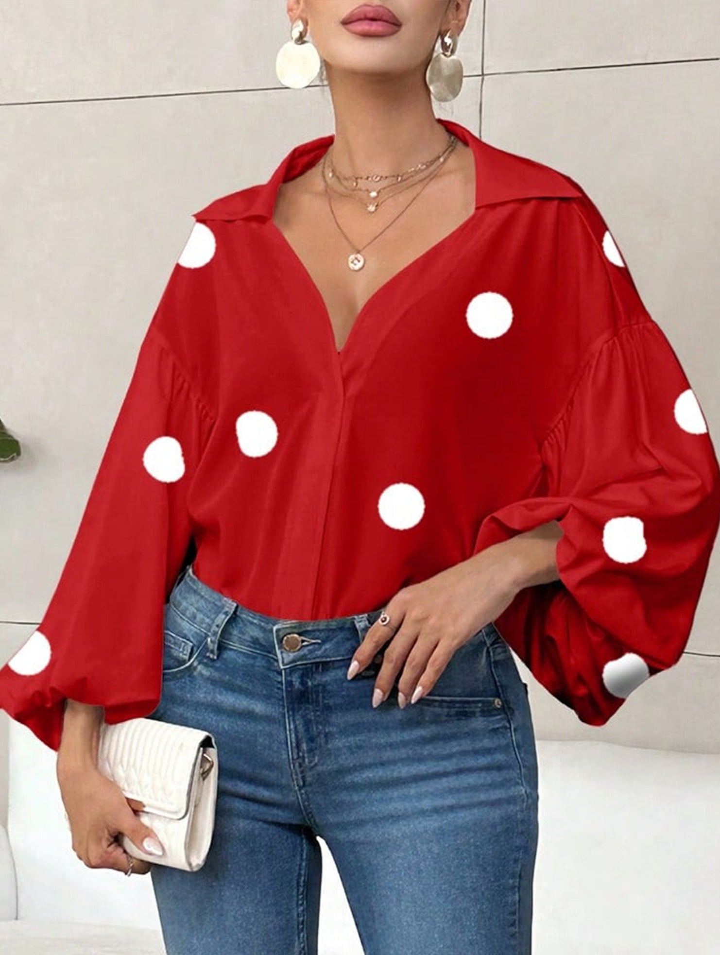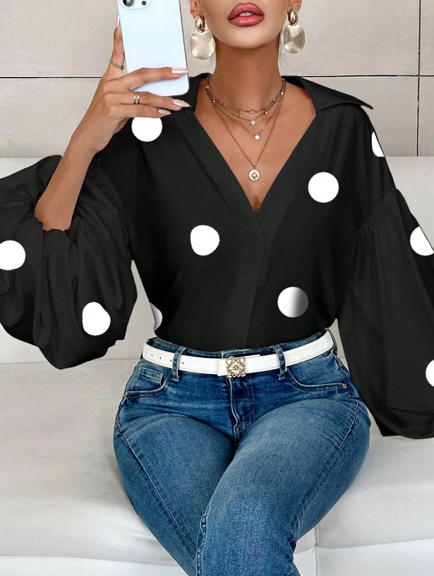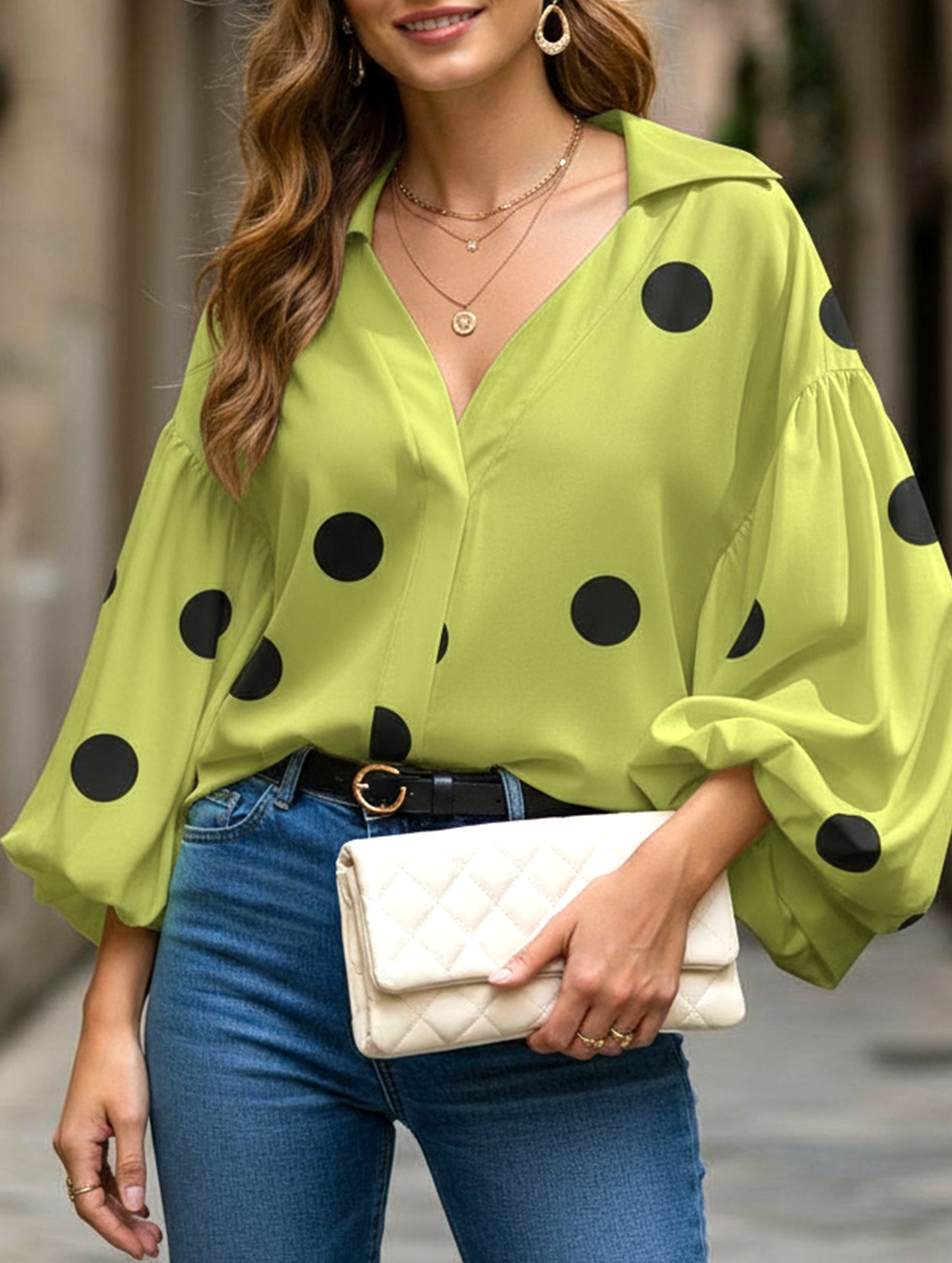 xPolka dot V-neck loose bubble long-sleeved shirt
