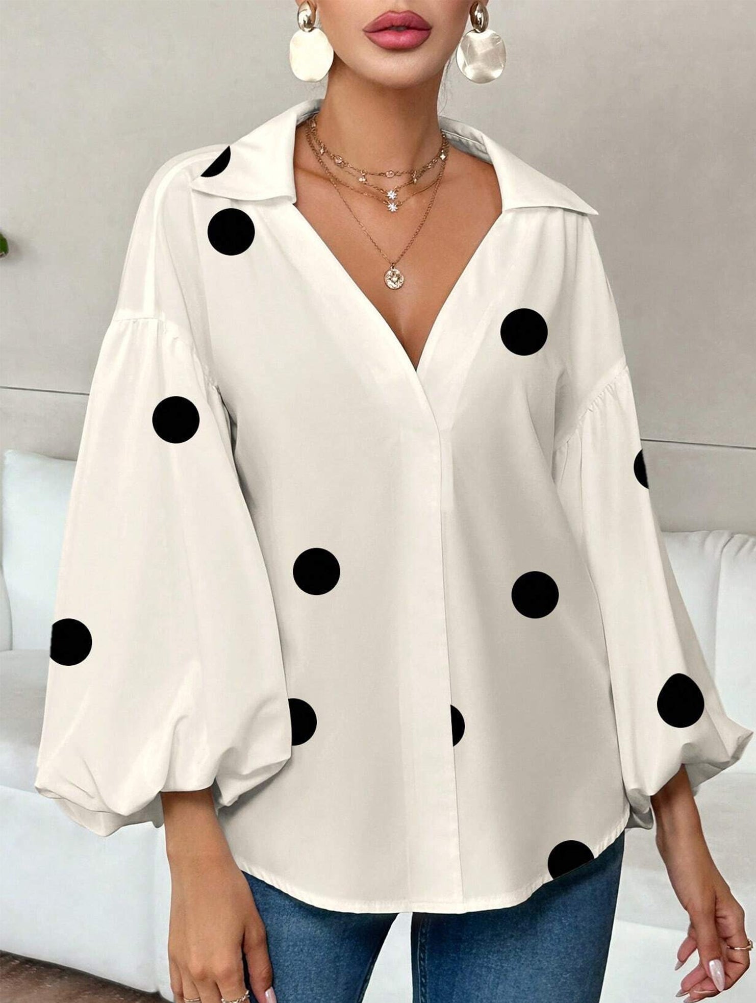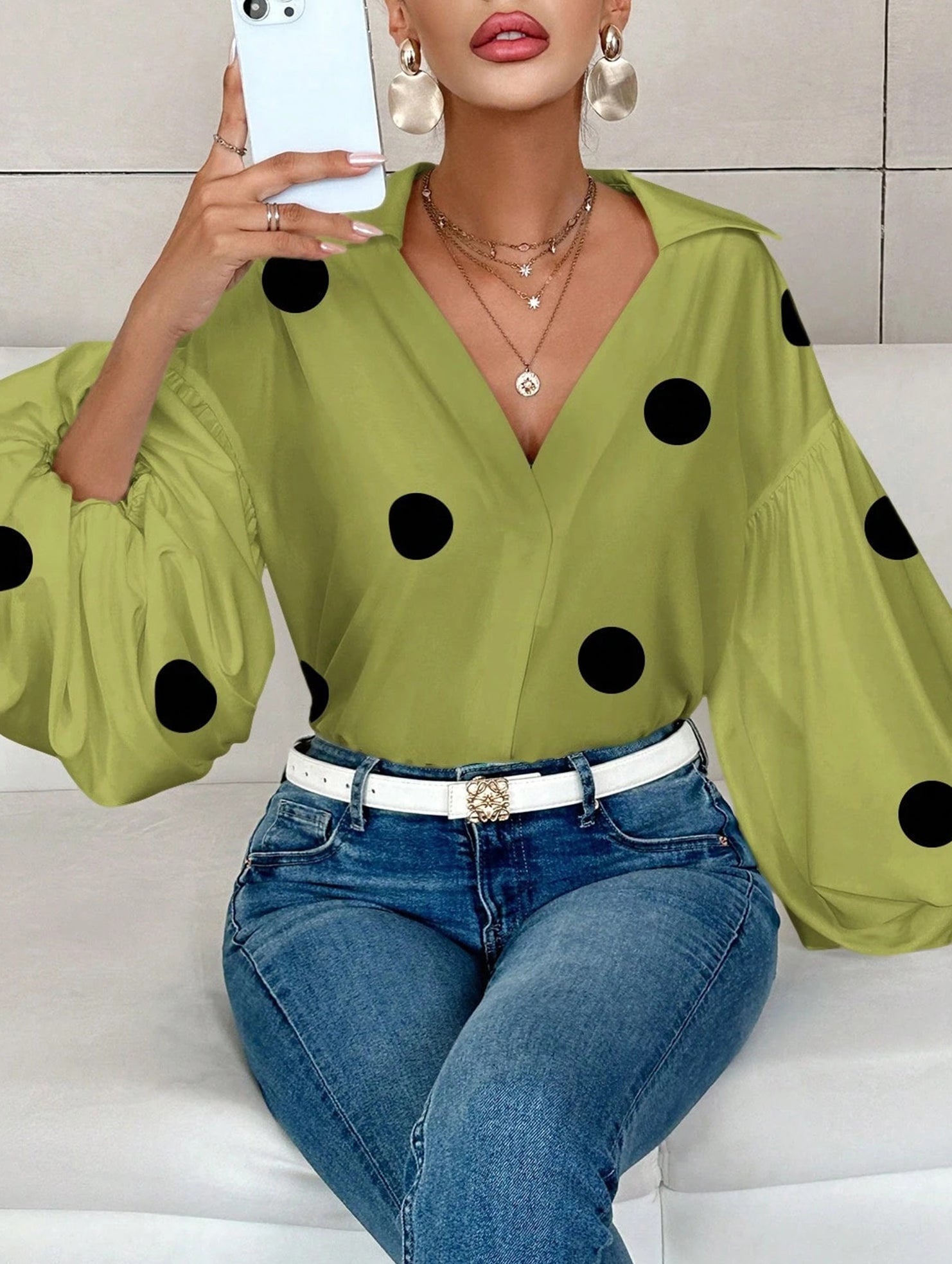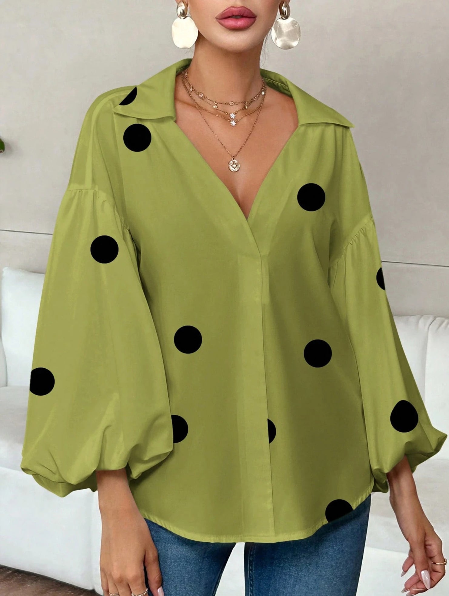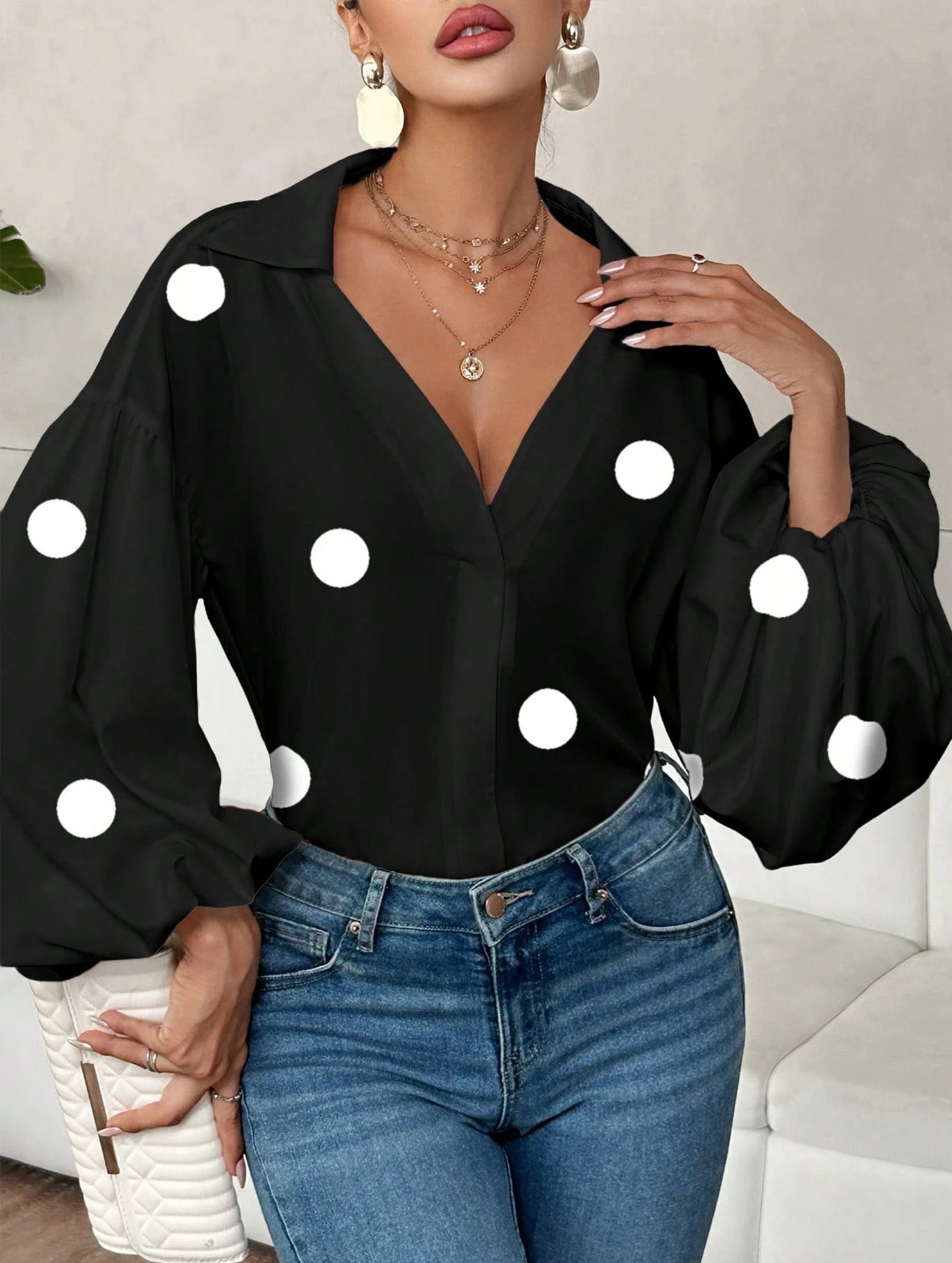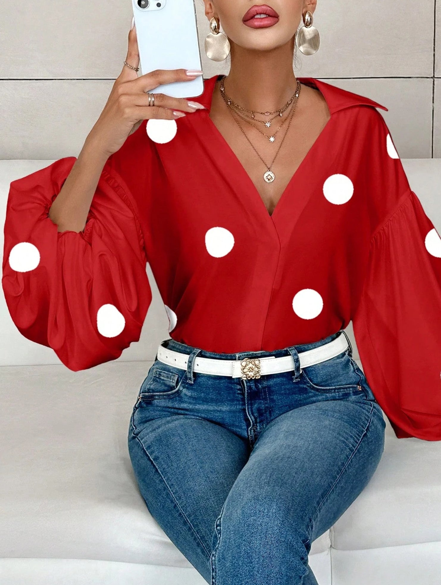 xPolka dot V-neck loose bubble long-sleeved shirt