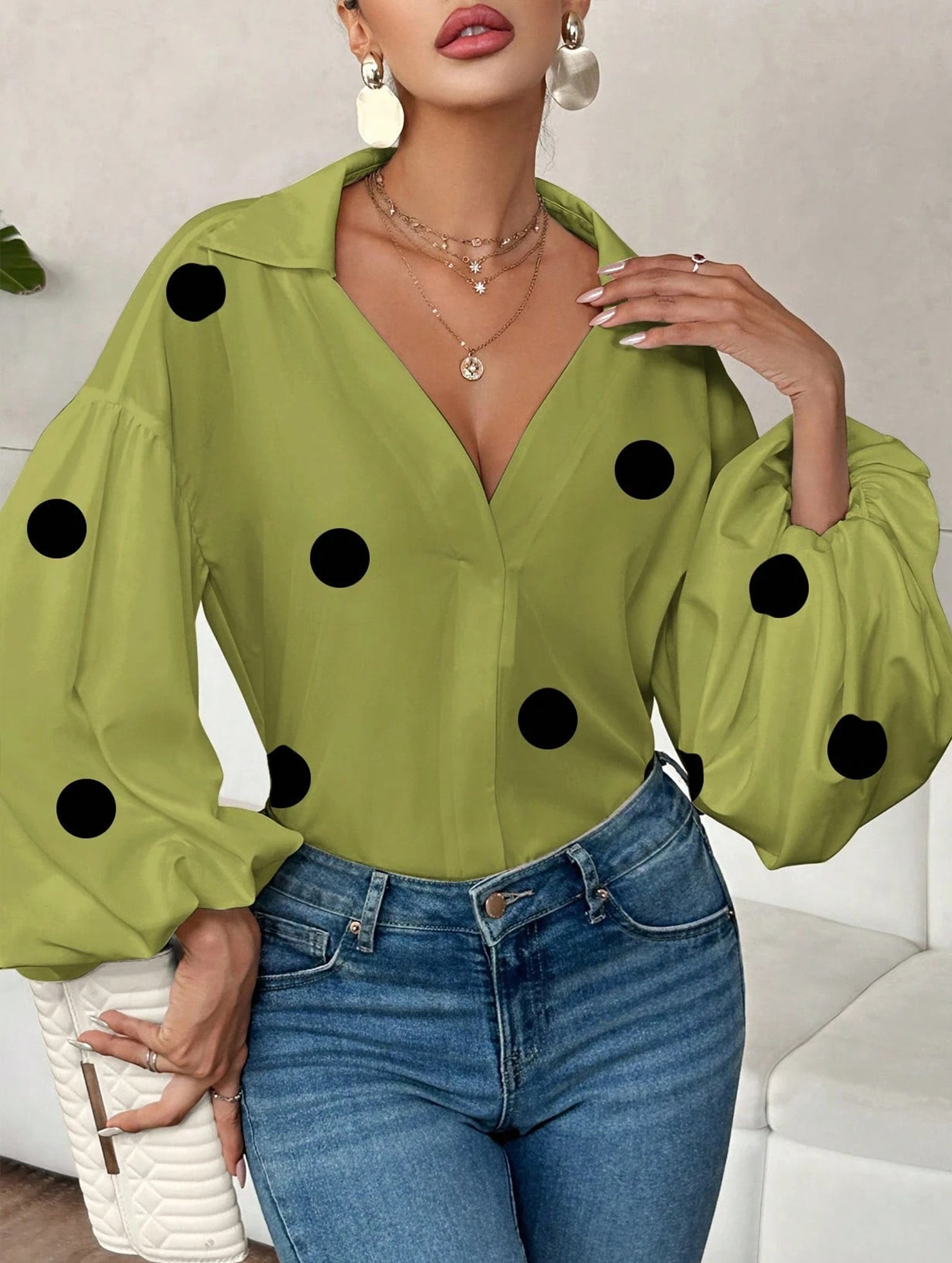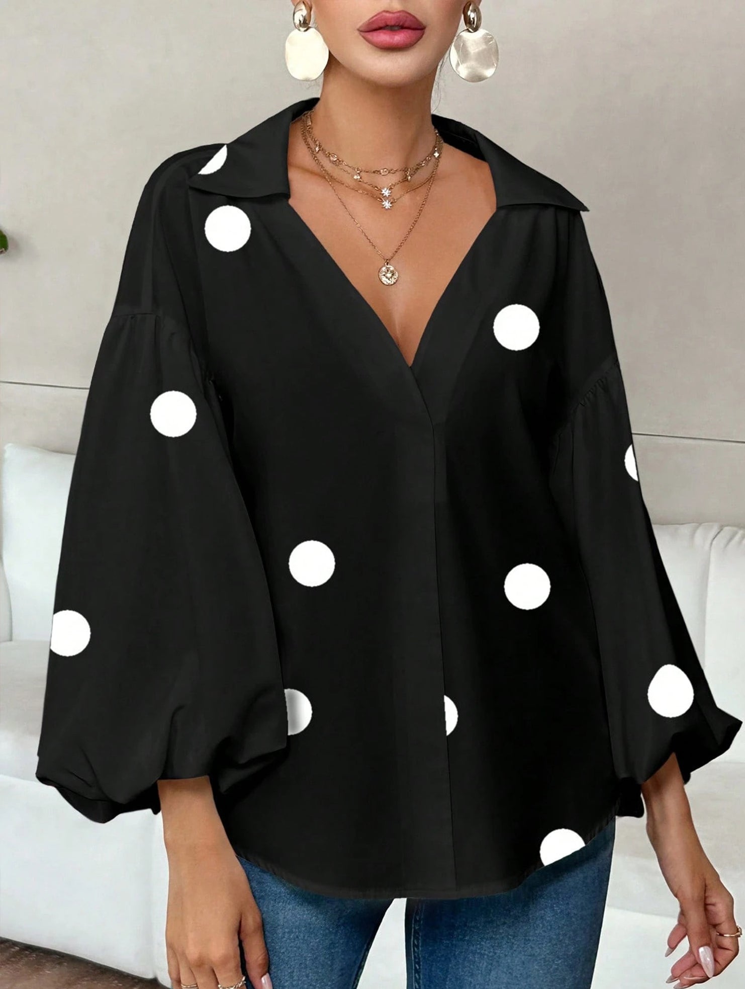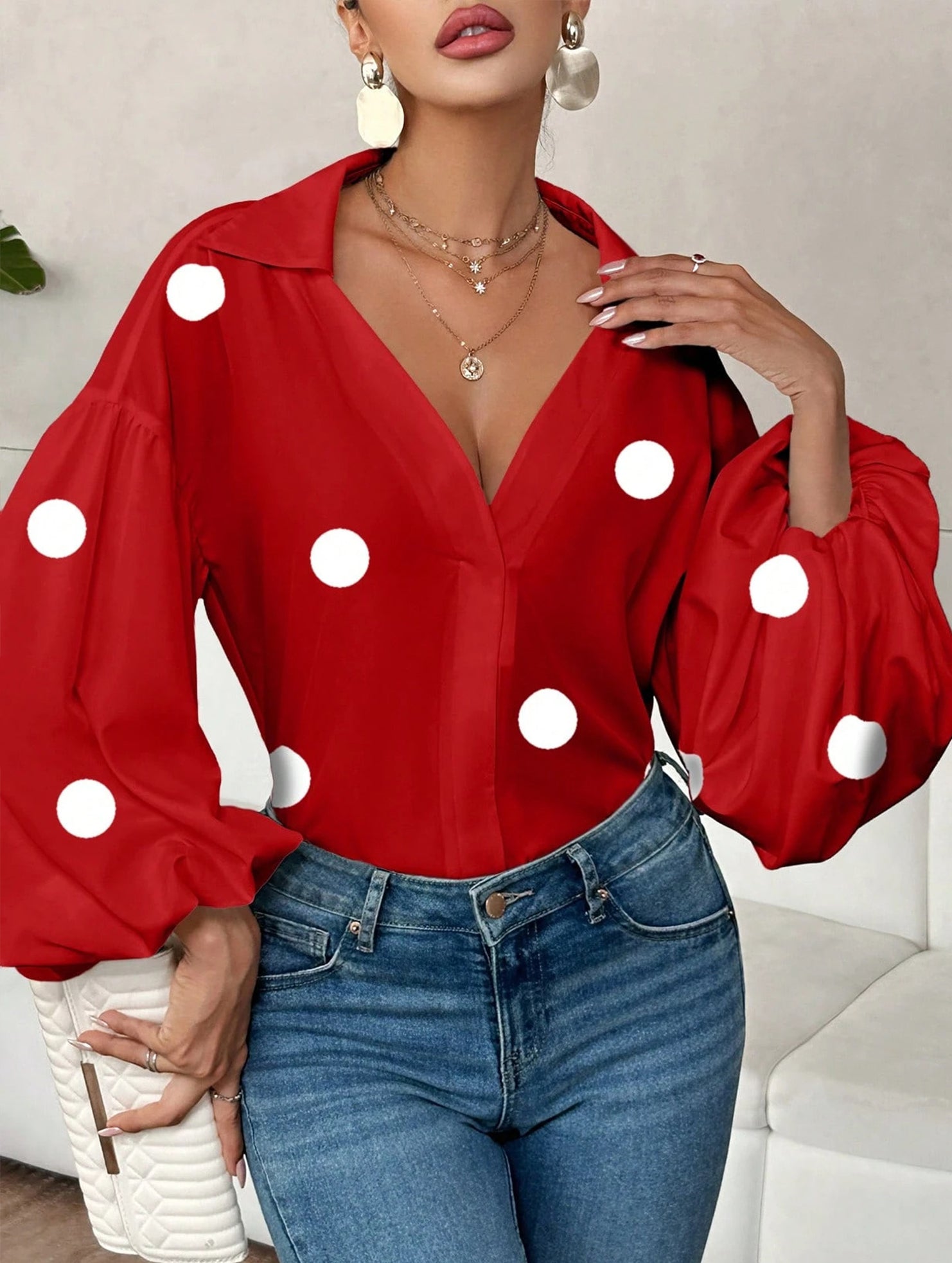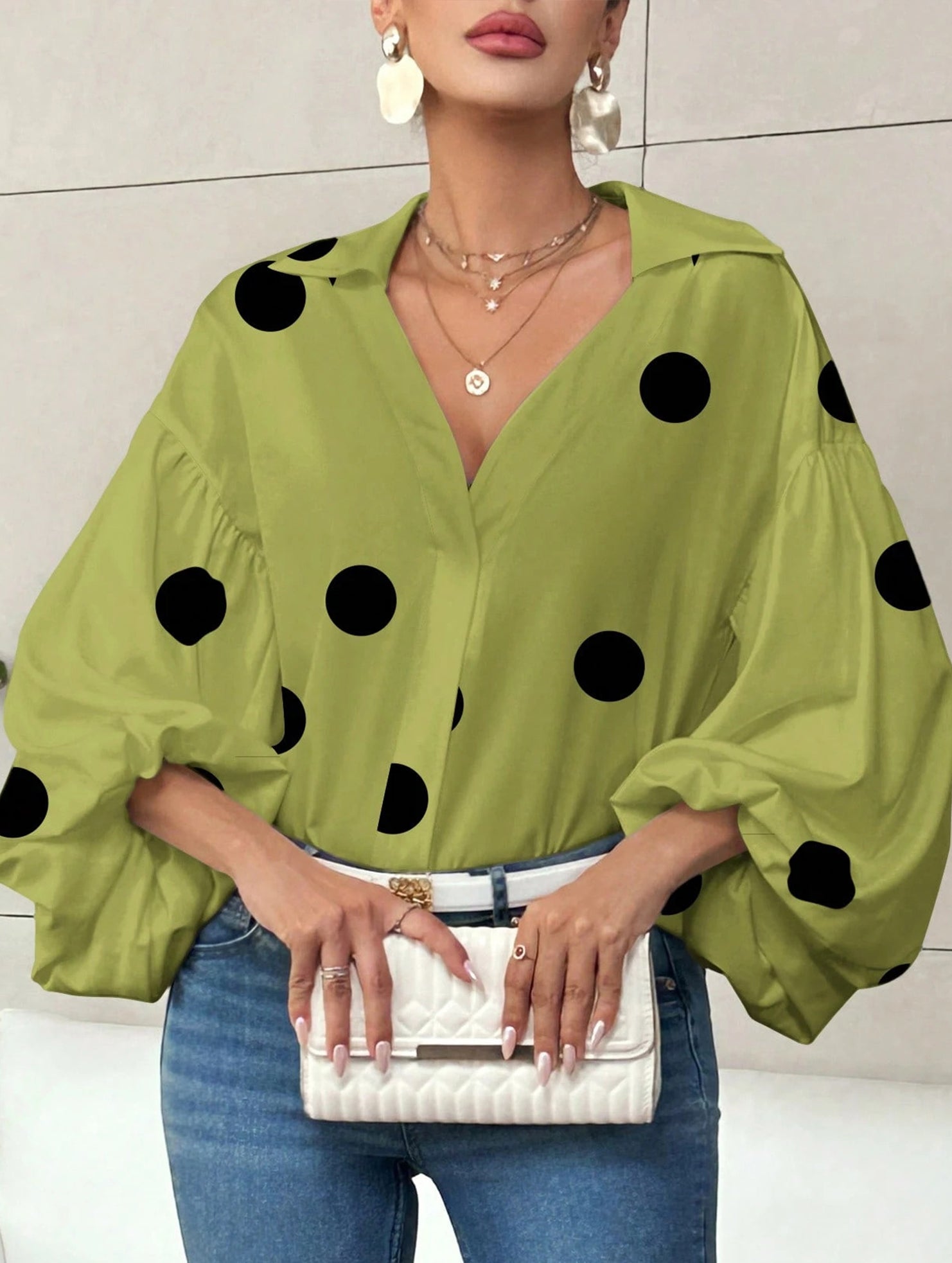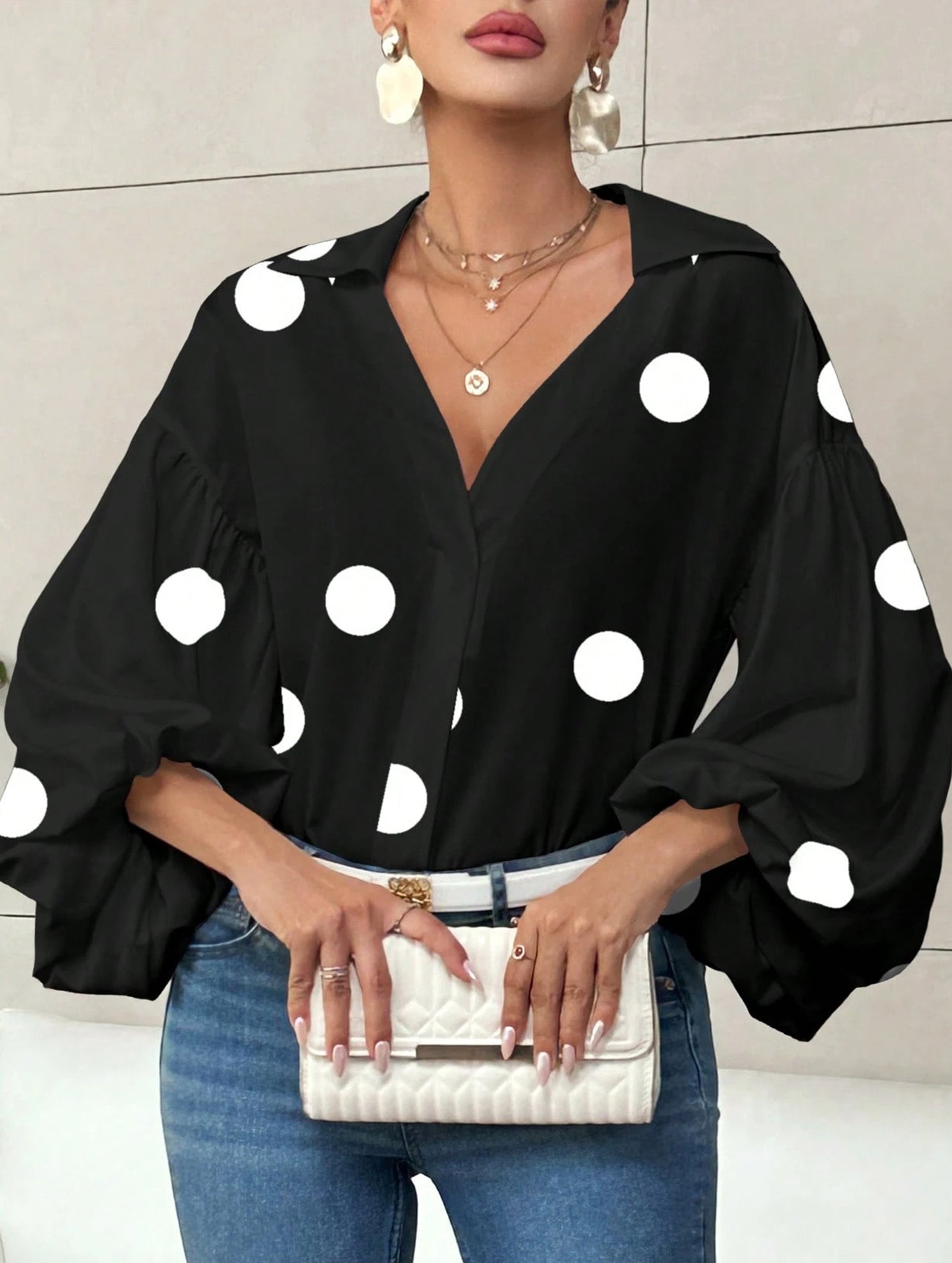 xPolka dot V-neck loose bubble long-sleeved shirt