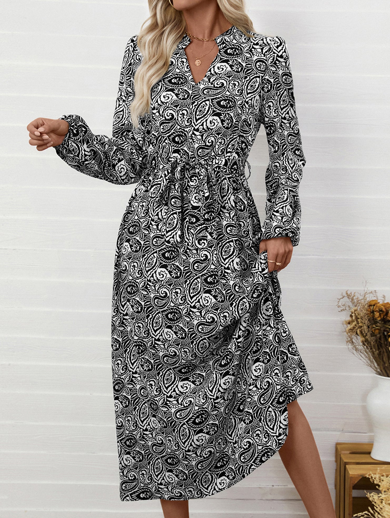 Printed elegant V-neck long-sleeved dress
