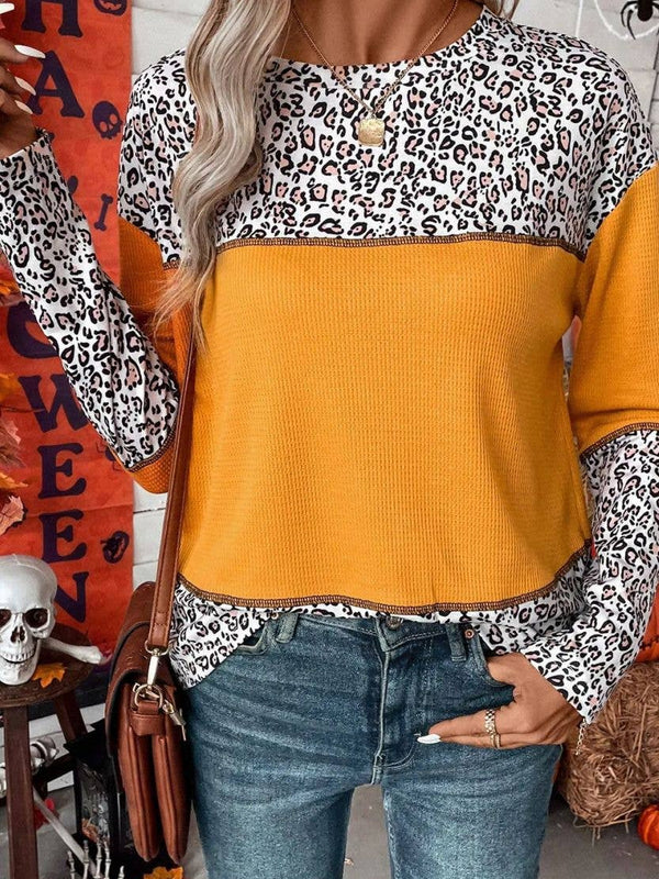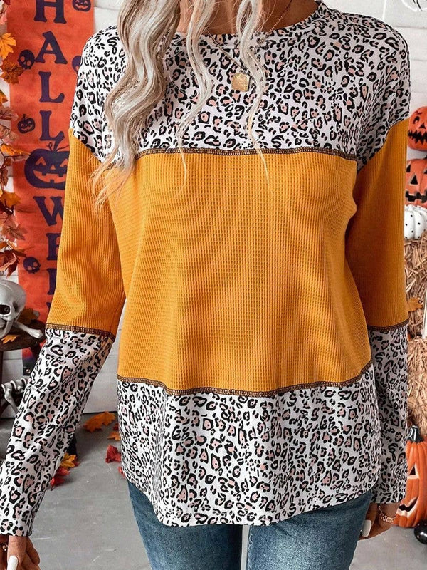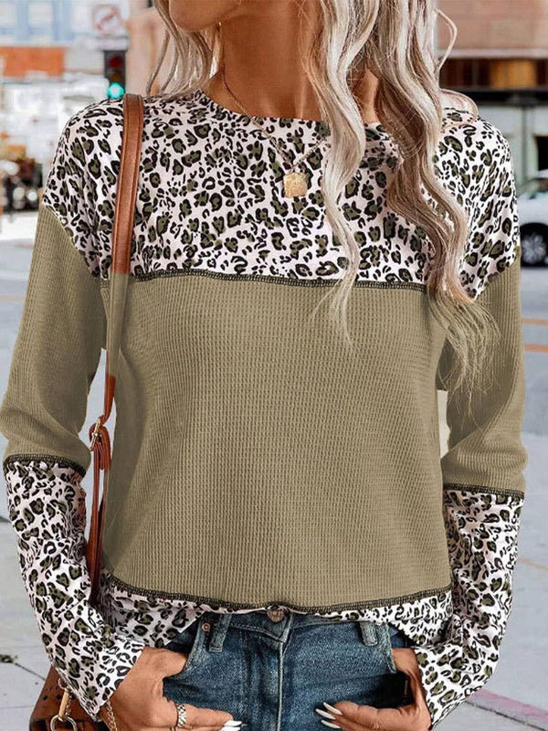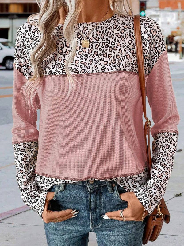 Pullover Leopard Print Patchwork Waffle Knit