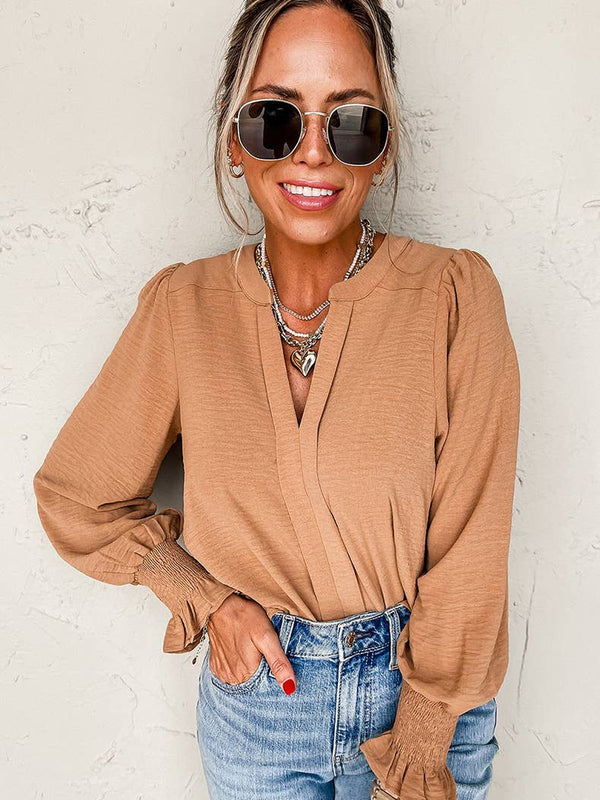 The Pullover V-Neck Long-Sleeved Casual Ruffled Shirt delivers a polished look while remaining comfortable and functional.