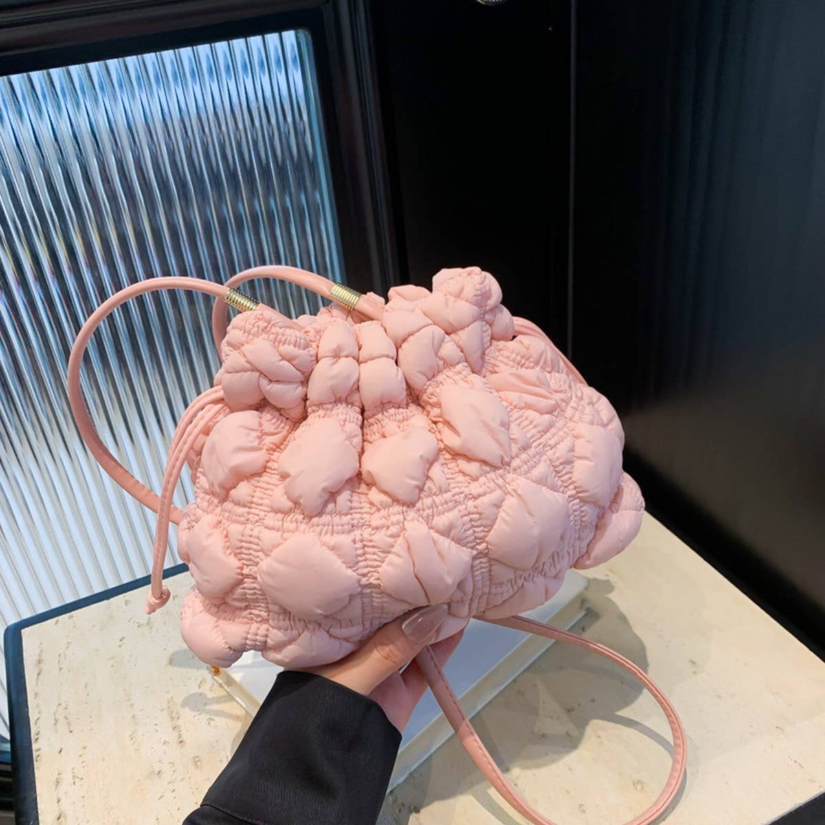 Experience versatile styling with the Quilted Cloud Bucket Bag Nylon Drawstring Handbag, crafted to adapt effortlessly.