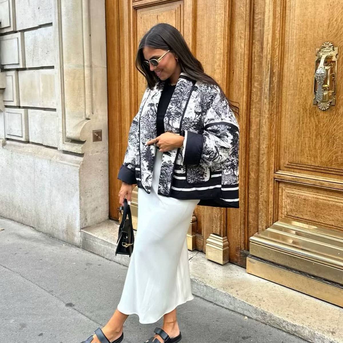 The Quilted Jacket With Floral Print Lapel brings a fresh balance of structure and ease into your wardrobe.