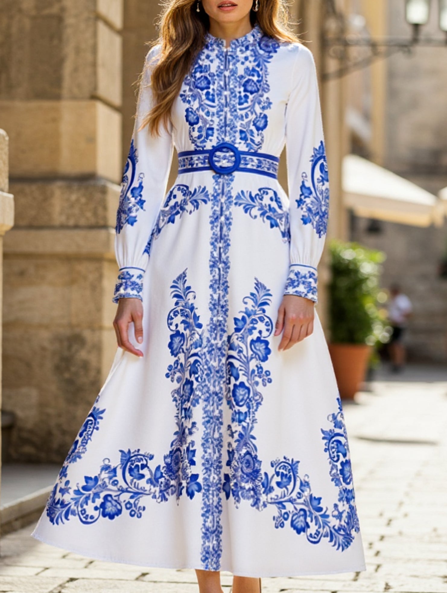 RETRO PALACE STYLE PRINT STAND COLLAR SLIT DRESS