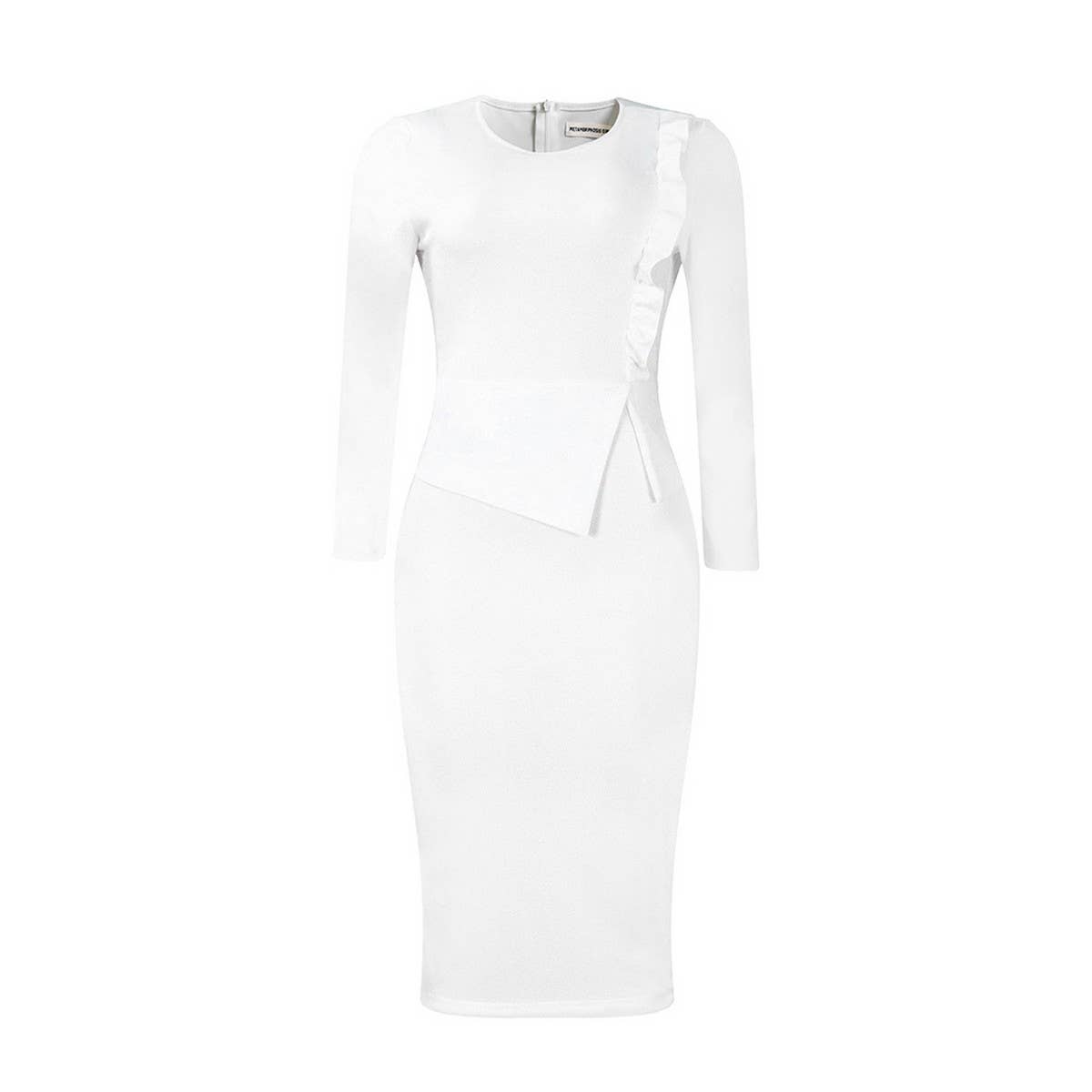 The Ruffle Hem Solid Color Round Neck Hip Dress adds a refined touch with its clean and modern silhouette.