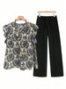 Solid Color Pantsuit Lotus Sleeve Printed Top