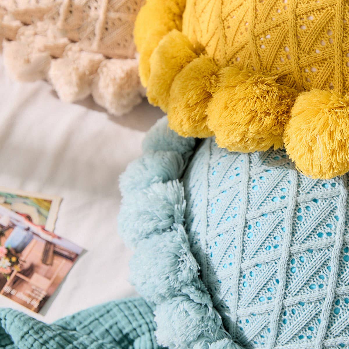 The Solid Color Round Wool Ball Knitted Throw Pillow adds a refined touch with its clean and modern silhouette.
