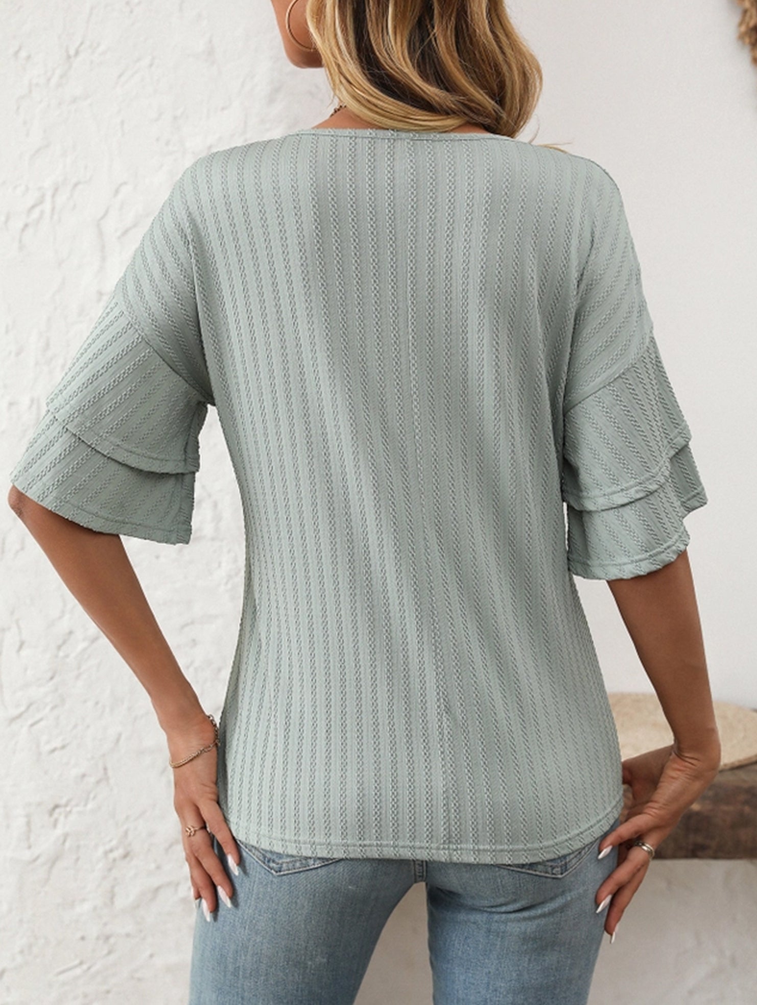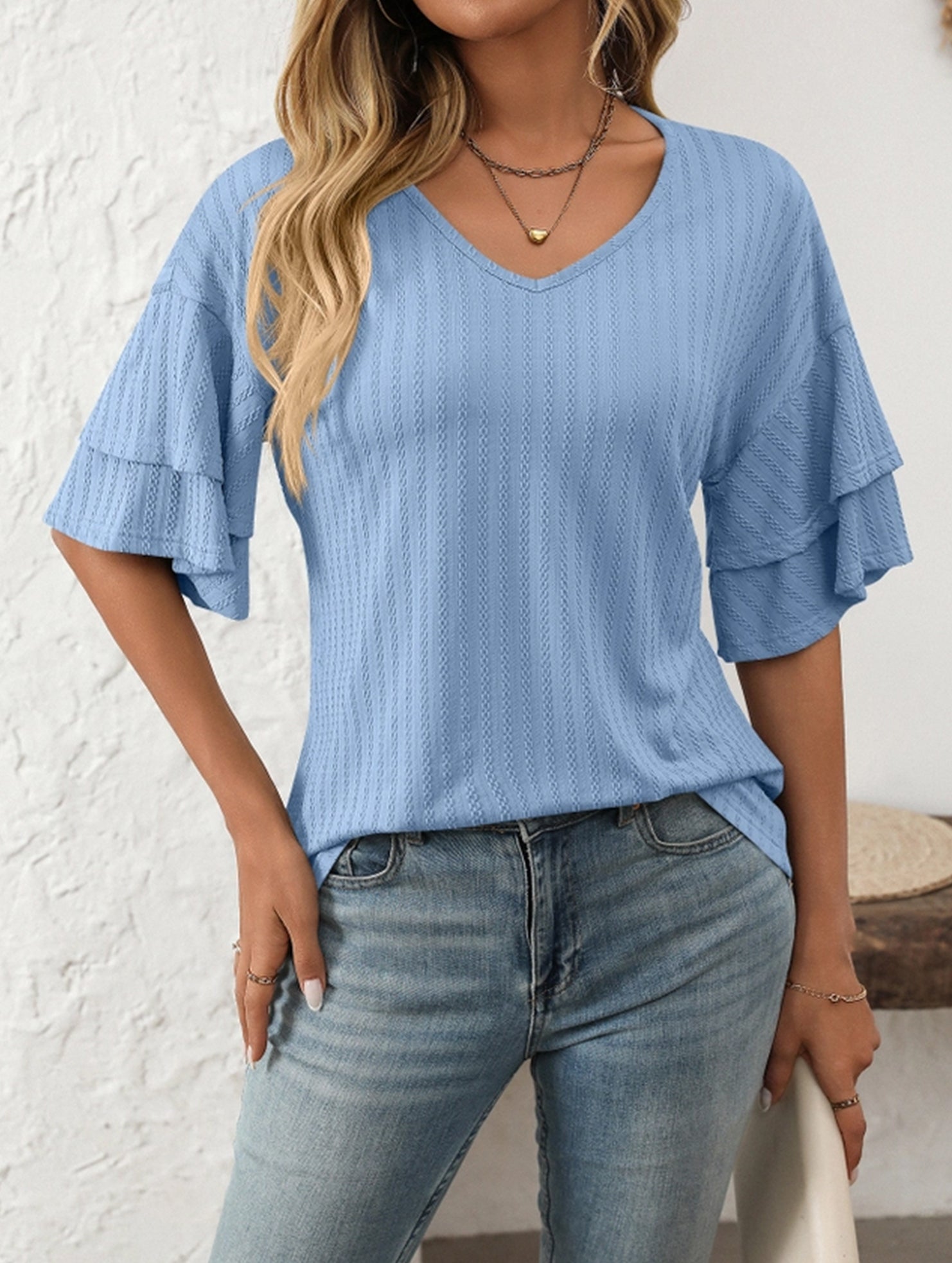 xSolid Color V-Neck T-Shirt with Lotus Sleeves – Feminine, Soft & Breathable