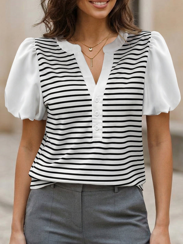 Designed to complement everyday outfits, the Stripe Patch V Neck Puff Sleeve Tee brings a refined yet wearable feel.