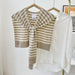 The Striped Knitted Outer Shawl adds a refined touch with its clean and modern silhouette.