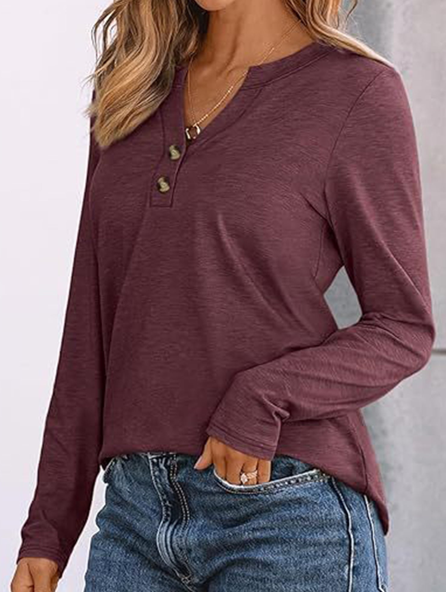 Stylish solid color long-sleeved V-neck button T-shirt