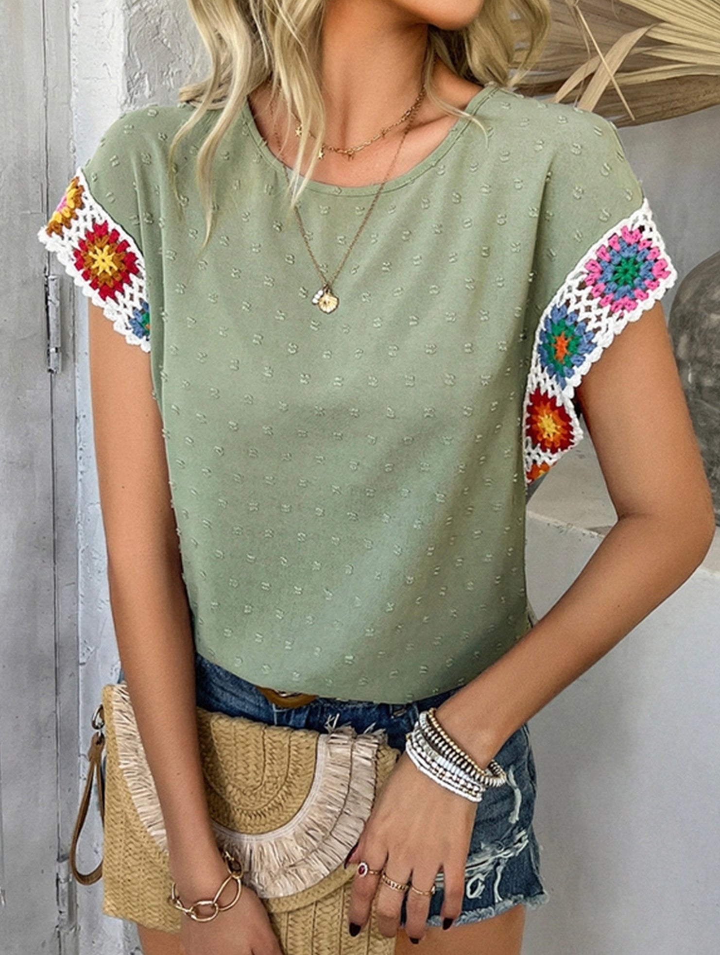 Embroidered Polka Dot Top ??Women's Casual Round Neck Short Sleeve Blouse