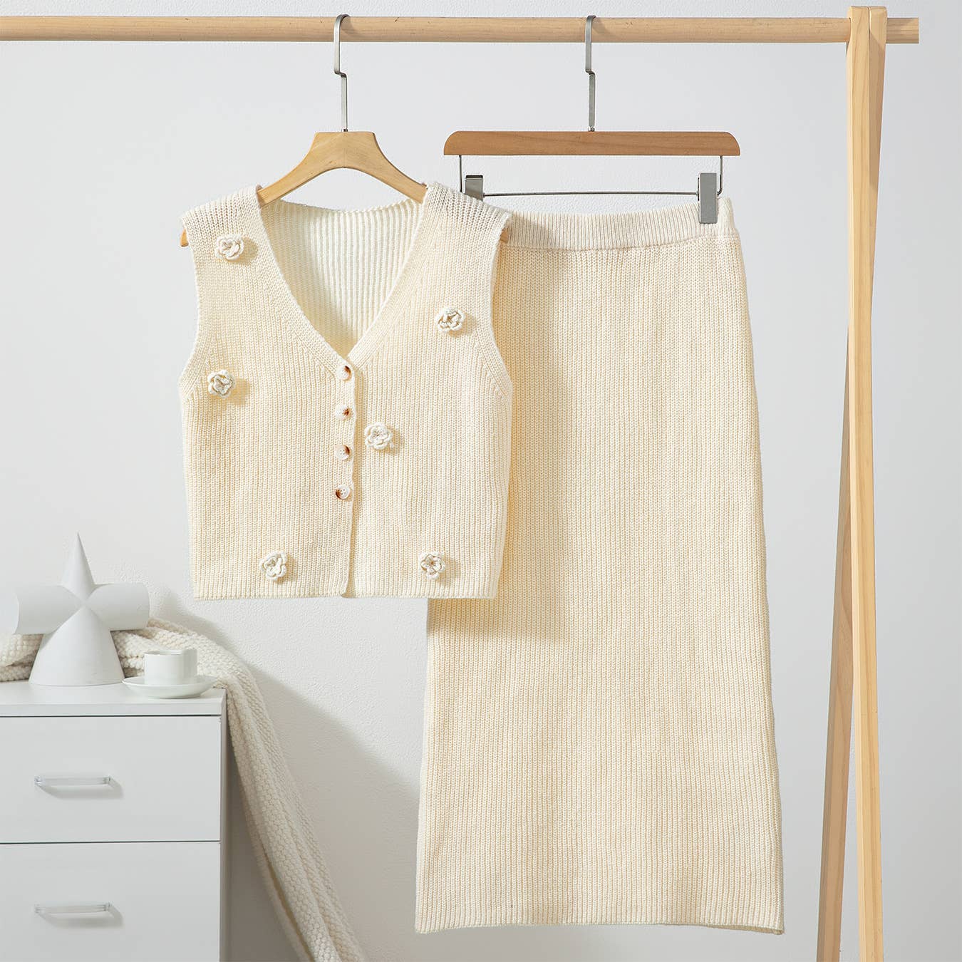 This Three-Dimensional Floral Skirt Vest Knitted Set balances modern styling with practical comfort for daily wear.