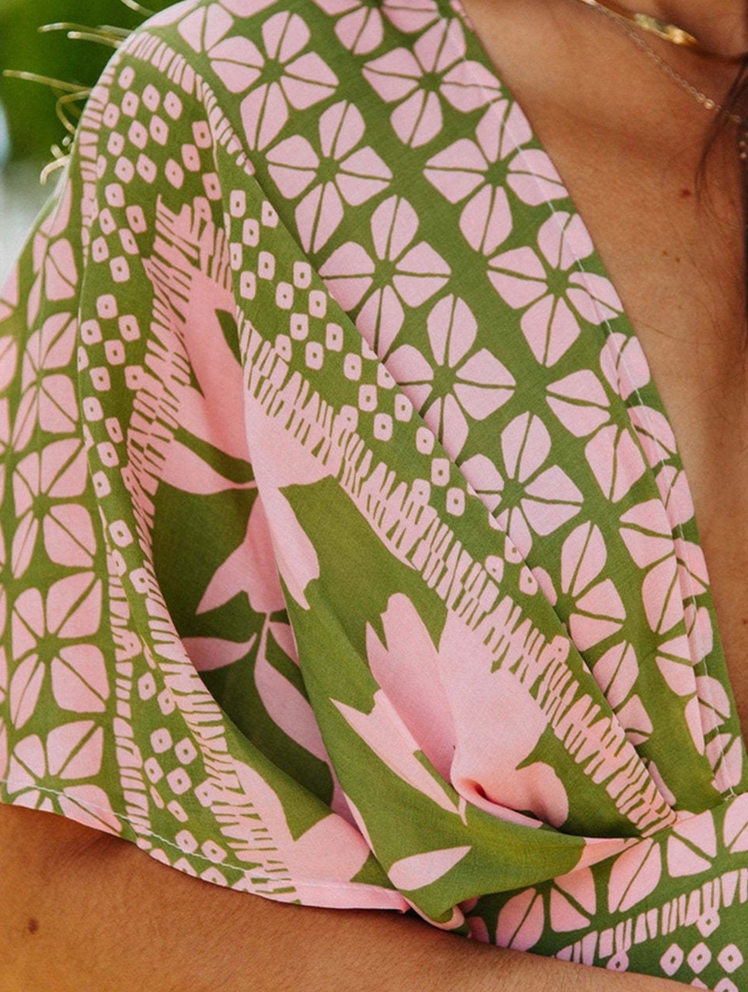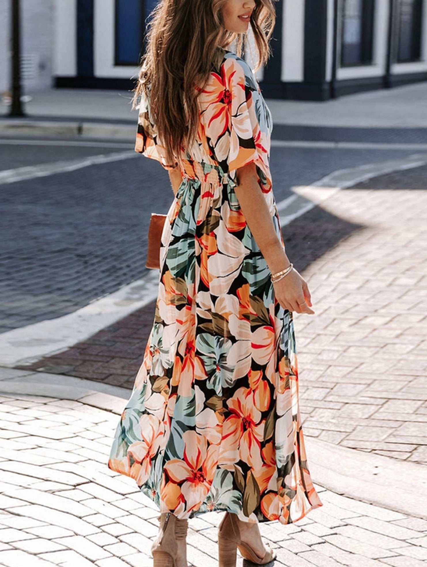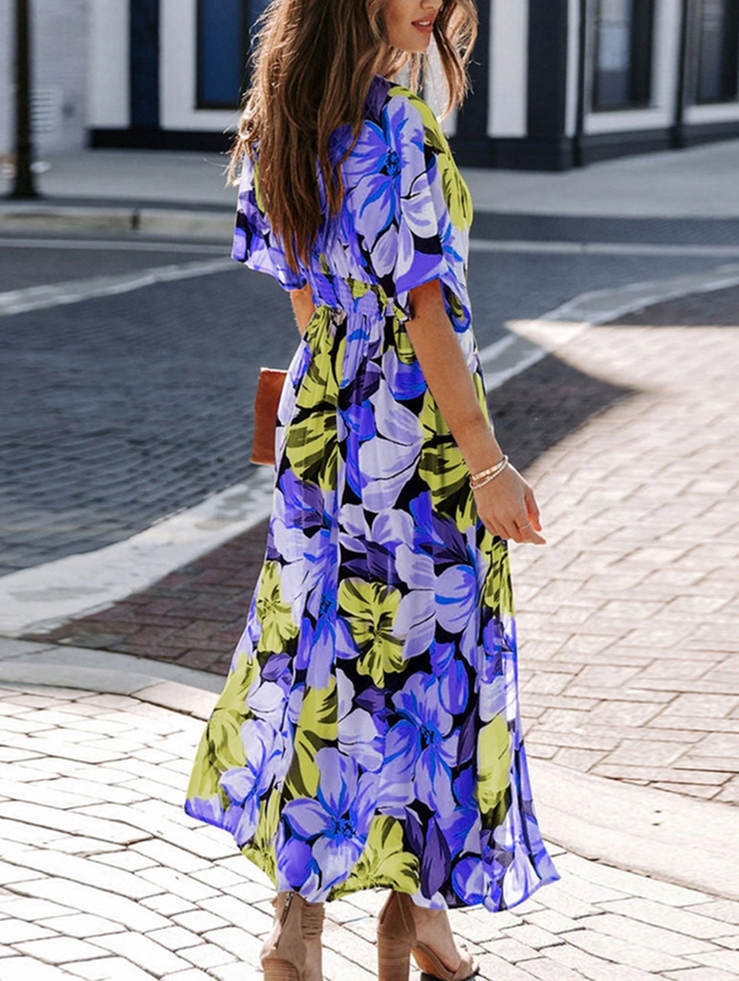 xThis V-neck high Slit Dress is light, soft, and easy to wear. It has a high waist, a pretty print, and a stylish slit that lets you move freely. The A-line shape gives a nice fit and flowy feel.