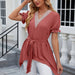 With a clean silhouette and easy wearability, the V-Neck Lace Jacquard Lace Up Short Sleeved Dress fits seamlessly into your rotation.