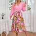 V-Neck Print Long-Sleeved Pleated Dress