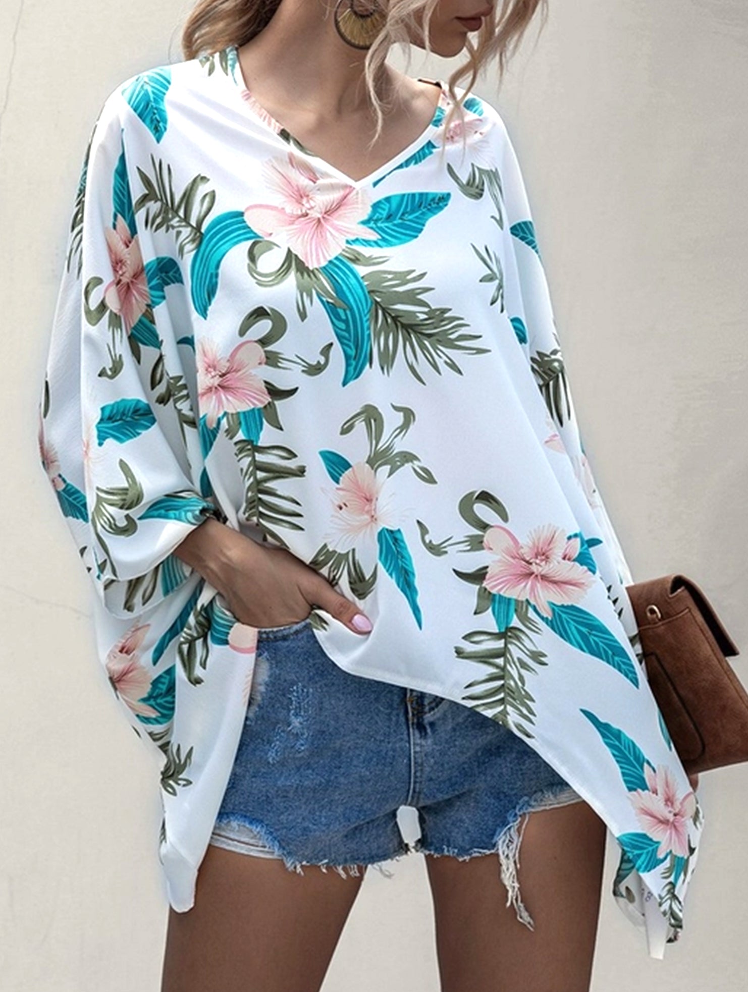 V Neck Printed Bat Sleeve Top with Loose Baggy Fit