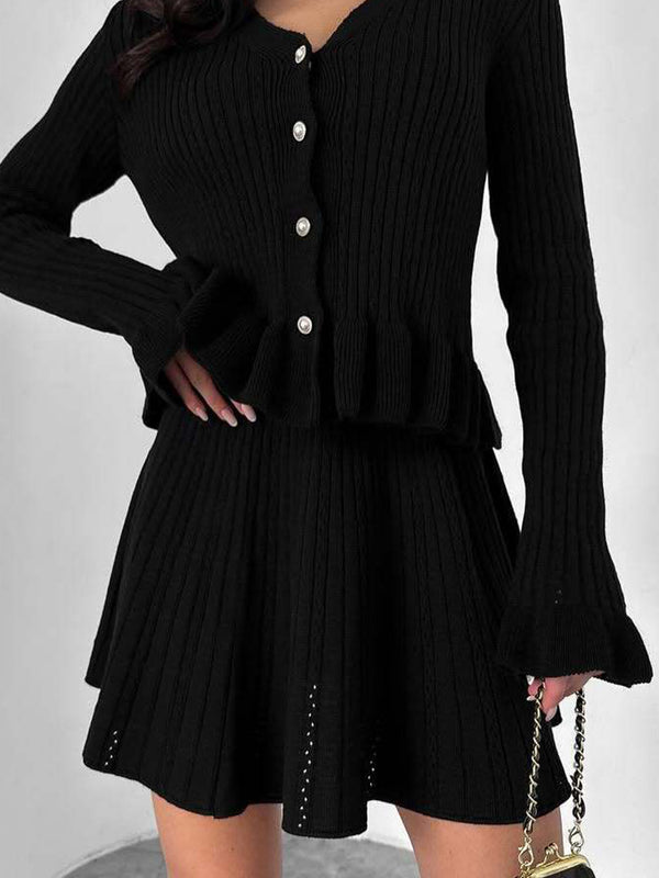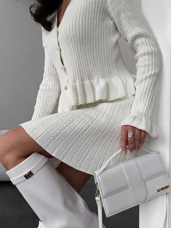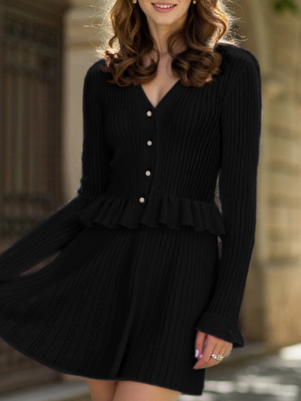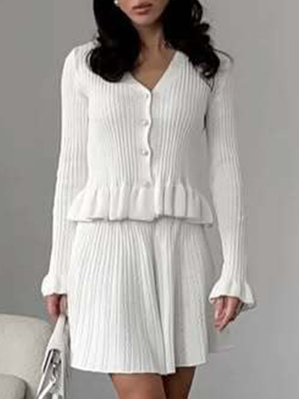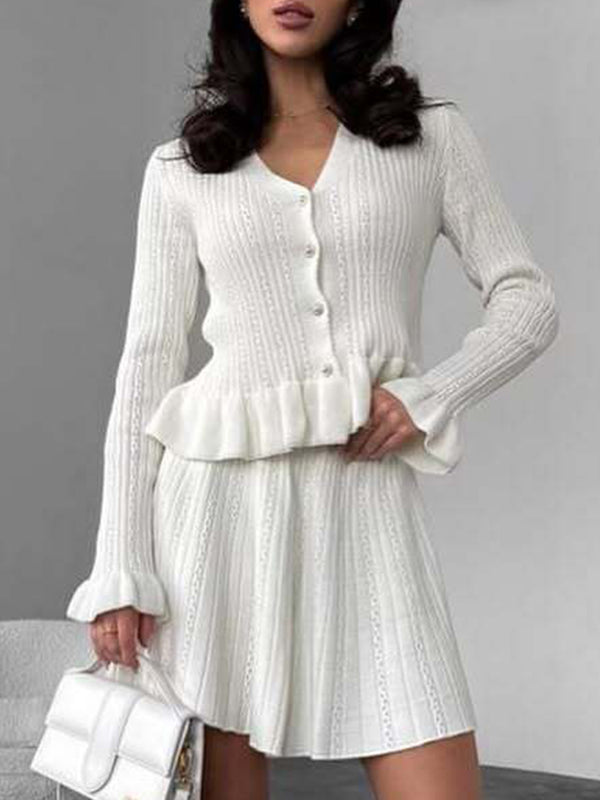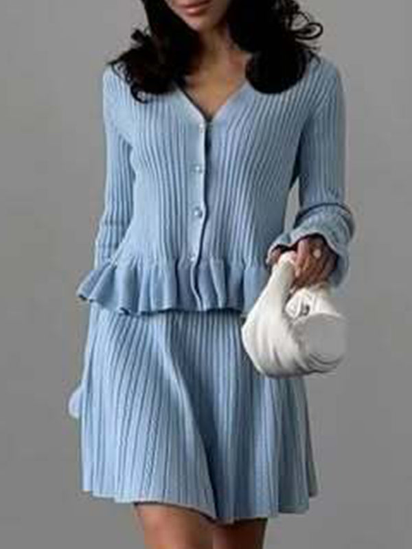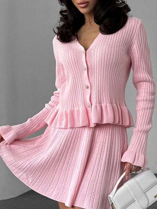 xV-neck ruffled waist-cinching knit two-piece set
