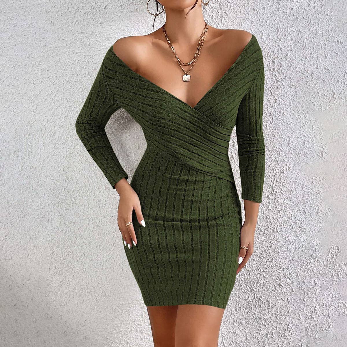 Designed to complement everyday outfits, the V-Neck Slim-Fit Dress With Hips And Long Sleeves brings a refined yet wearable feel.
