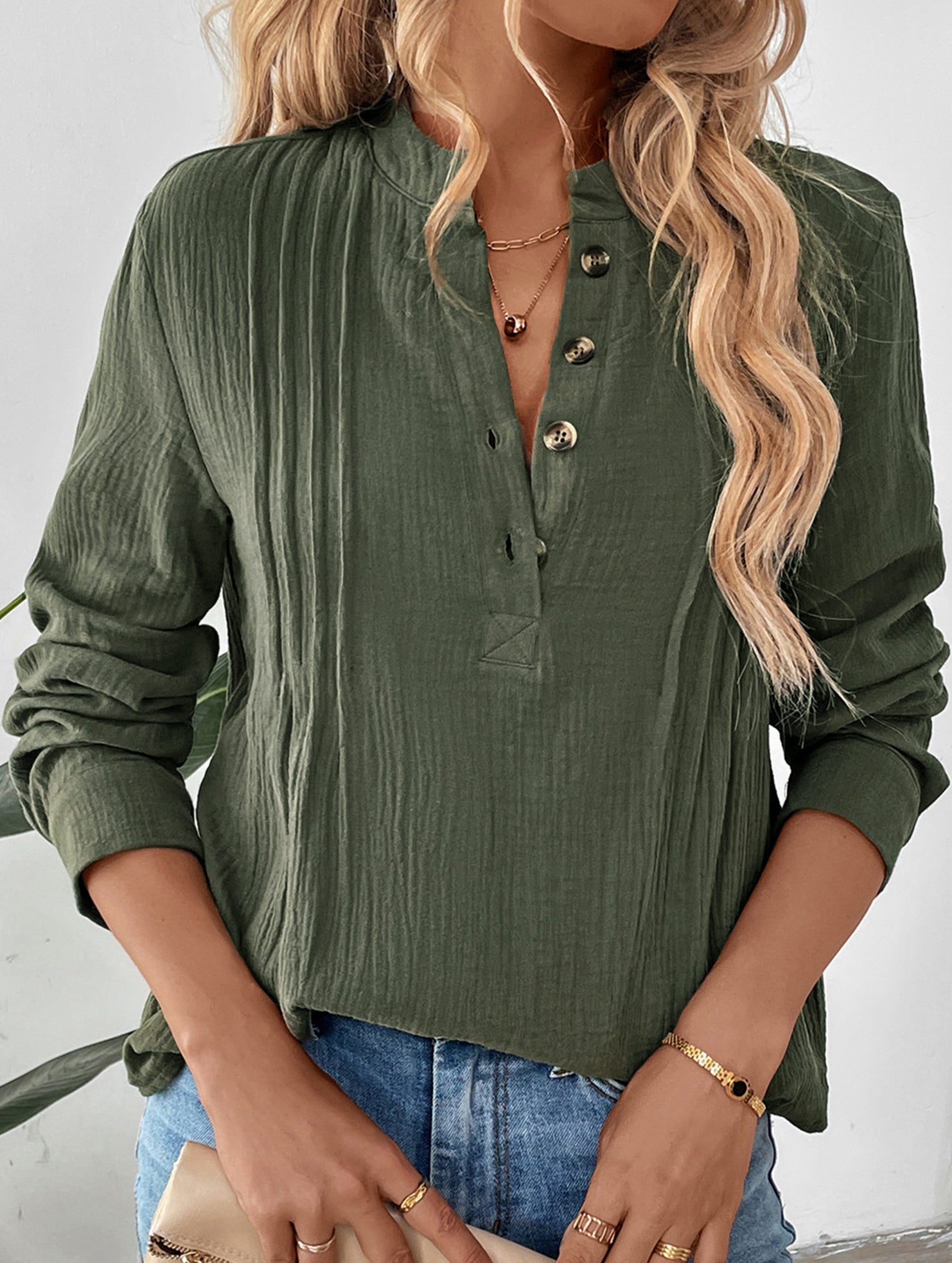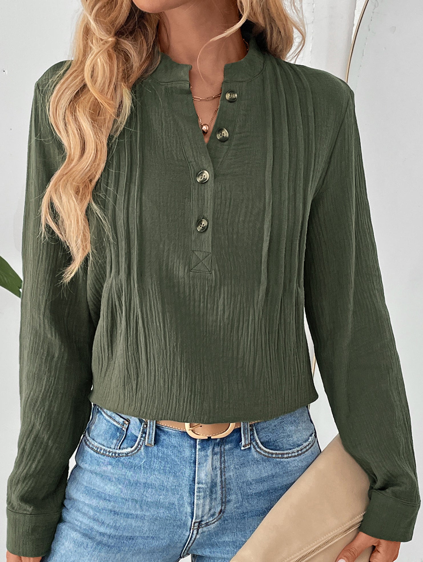 Vintage pleated stand collar half-open shirt