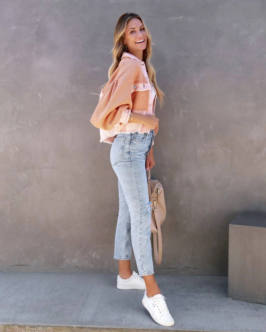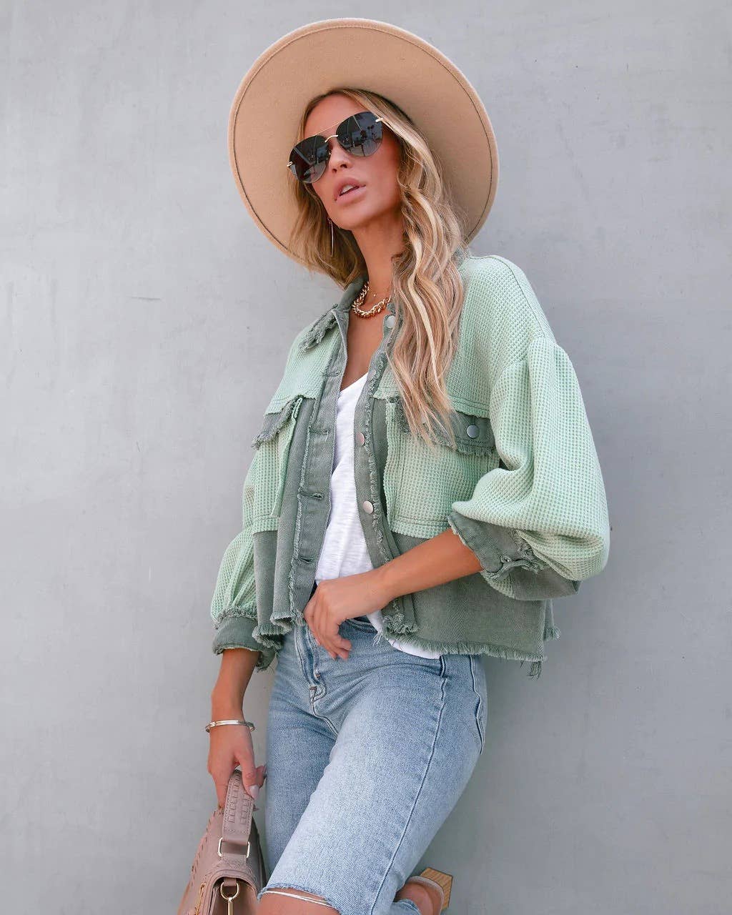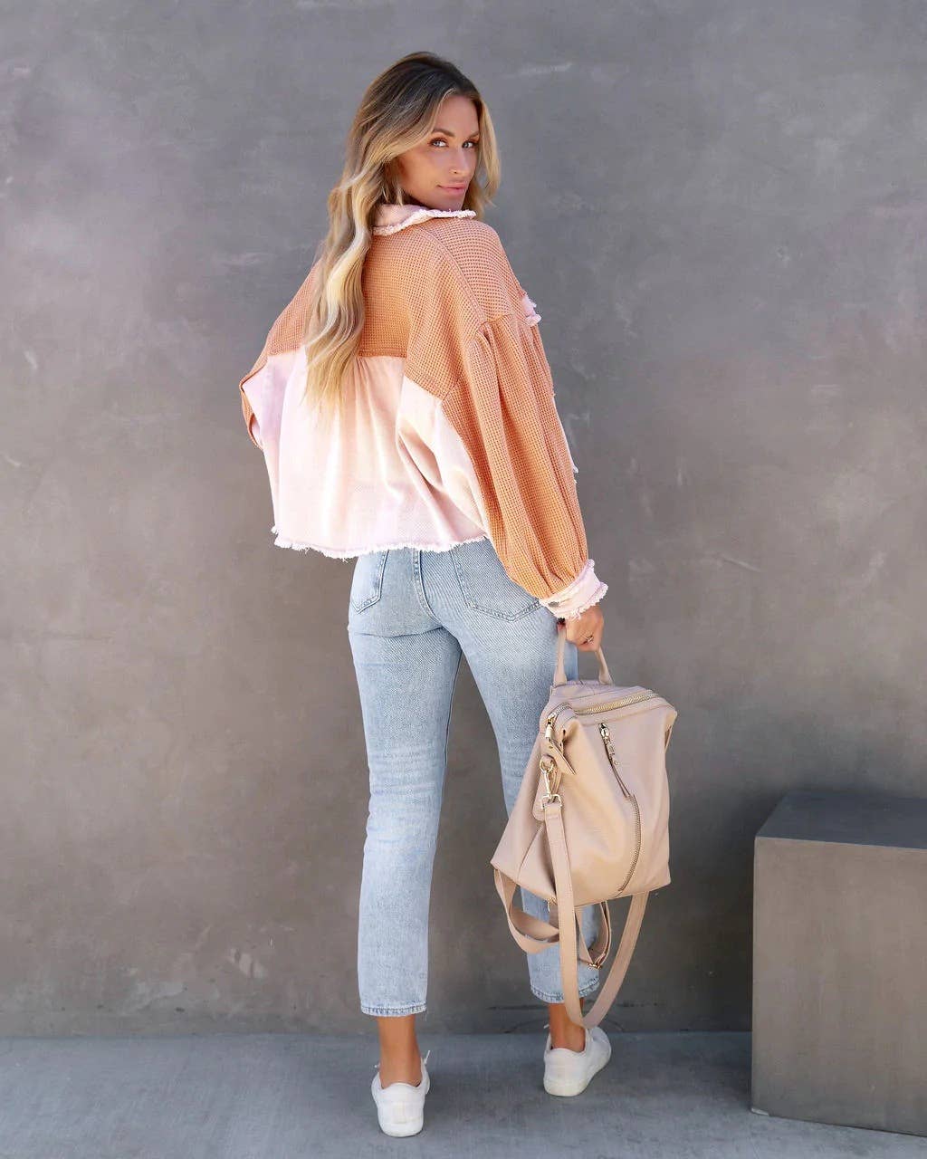 Use apricot,green,pink tones to build a cohesive outfit palette.